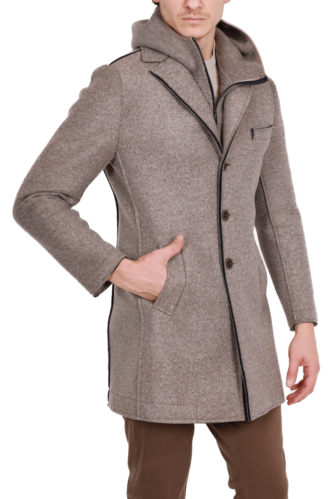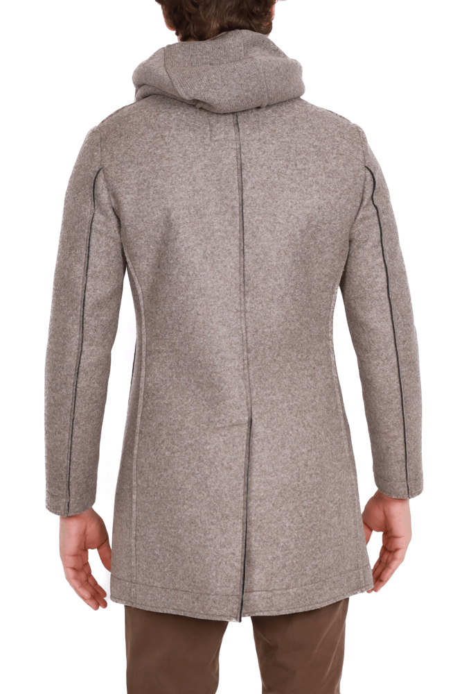 Cappotto corto monopetto in originale tessuto scuba stretch di misto lana con all’interno pettorina e cappuccio rimovibili,