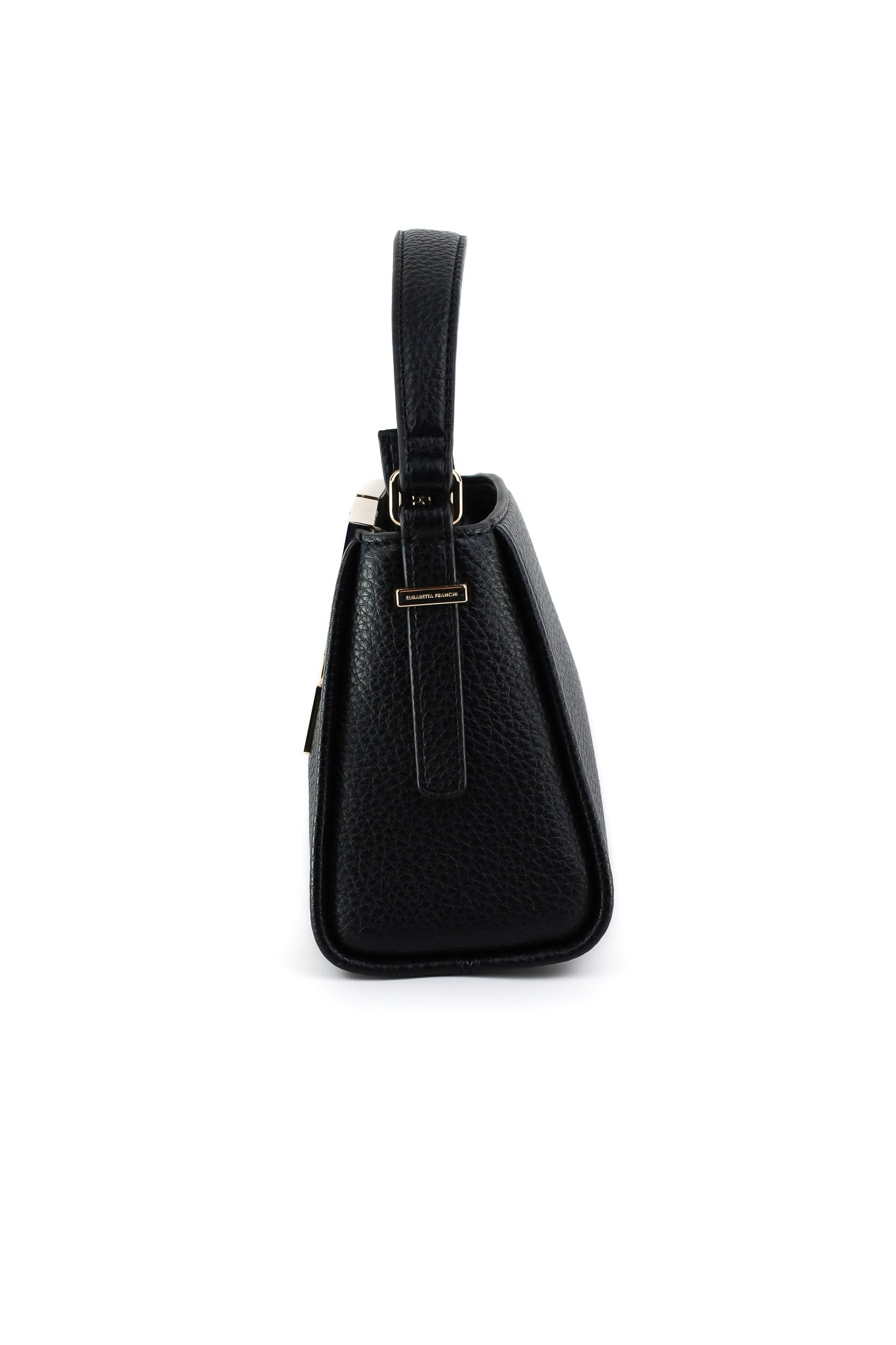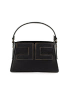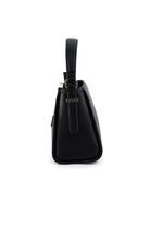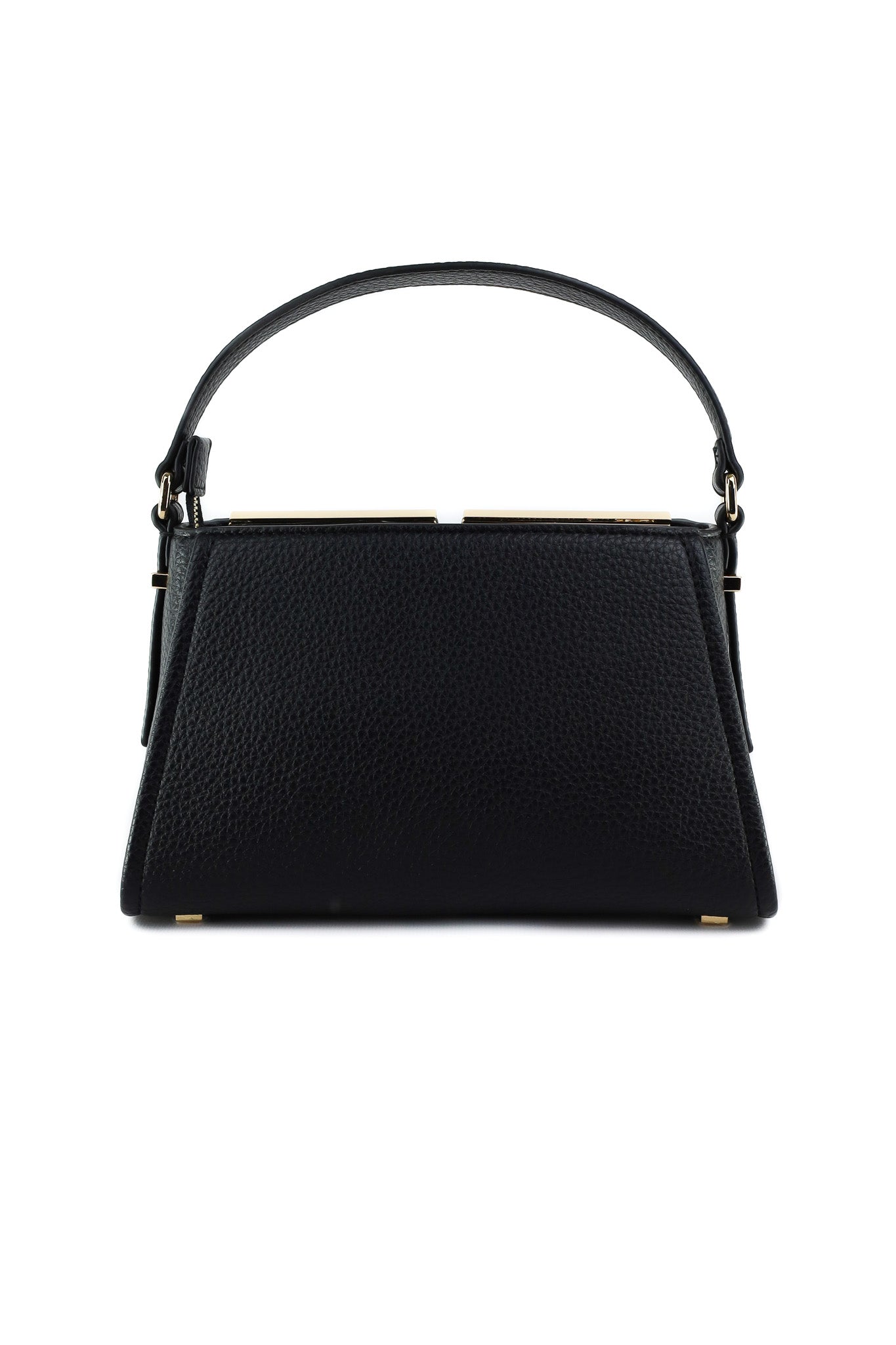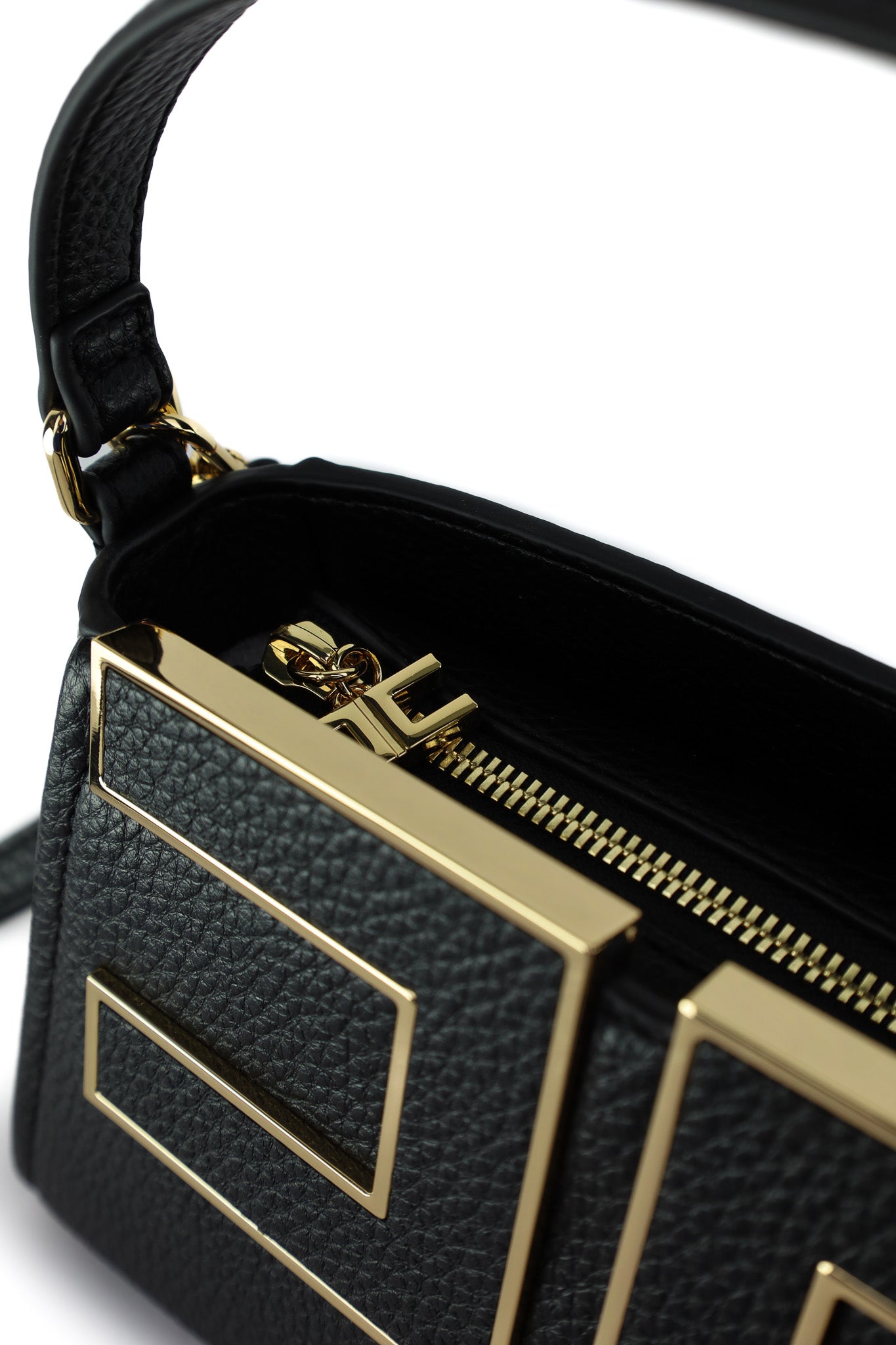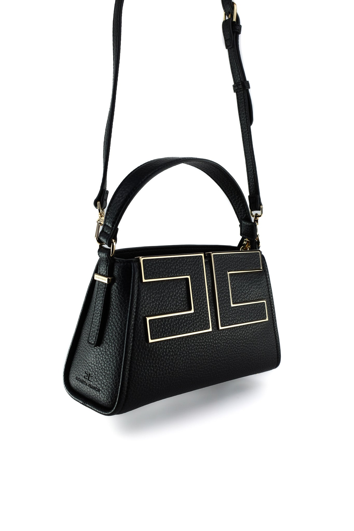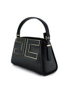 Borsa a mano in similpelle nera martellata con silhouette compatta e manico superiore regolabile. Il maxi logo geometrico frontale in metallo dorato aggiunge un tocco grintoso e sofisticato, perfetto per elevare outfit da giorno e da sera. Tracolla rimovibile.