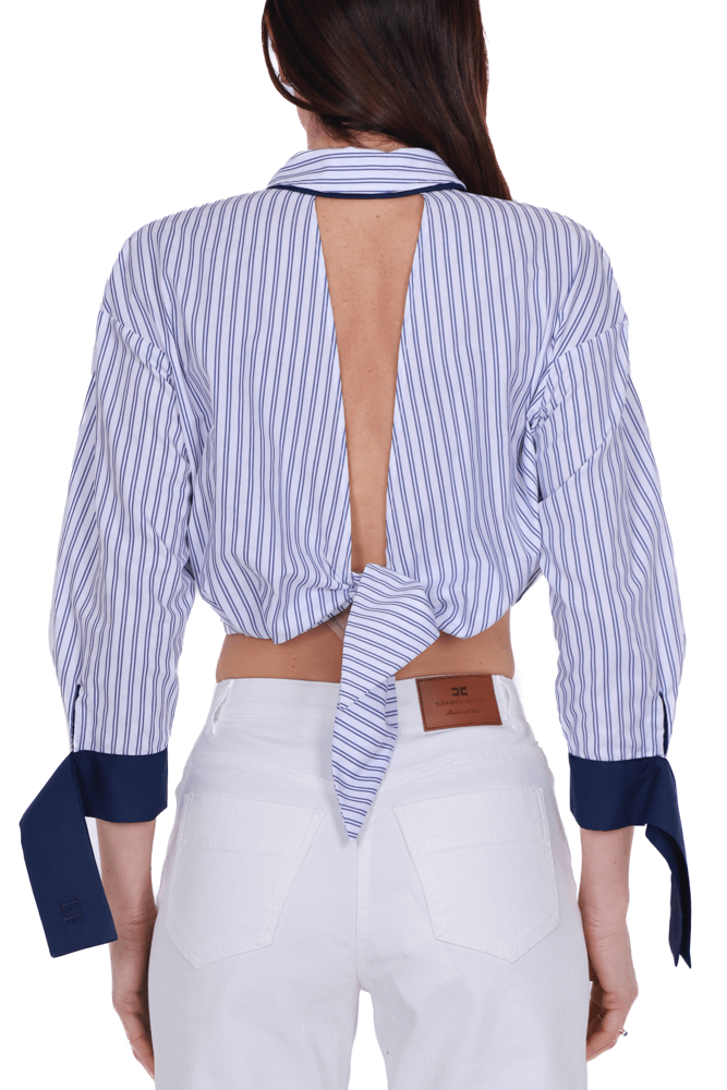 Camicia cropped con elastico al fondo in popeline di cotone a righe, modello con scollo e nodo sulla schiena arricchito da polsini in raso di colore a contrasto