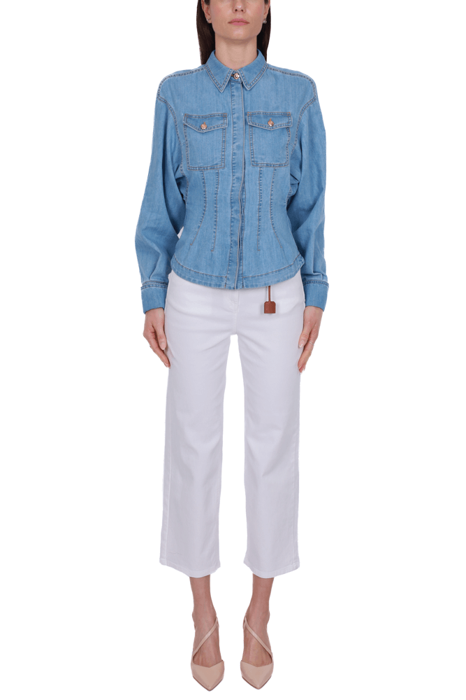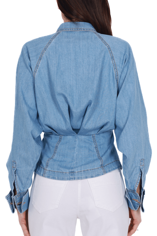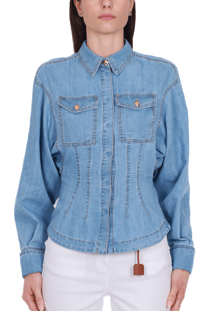 Camicia in jeans con maniche ampie e riprese del tessuto a creare un effetto baschina sul punto vita