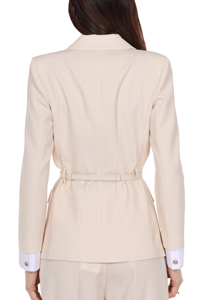 Giacca blazer dal taglio sartoriale con cintura in morbido tessuto di fresco lana con polsini a contrasto staccabili