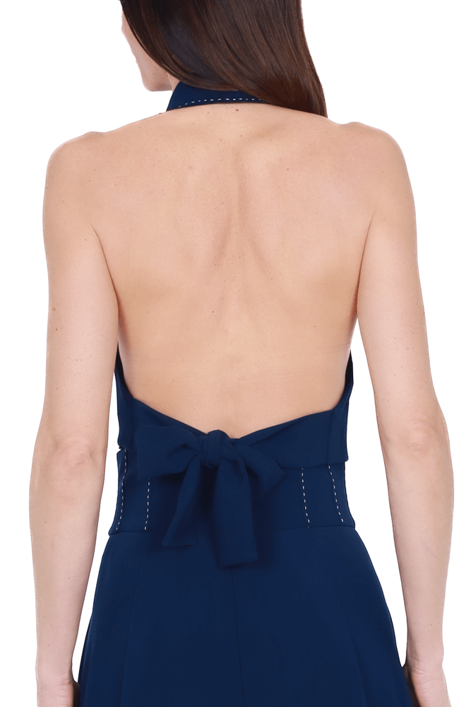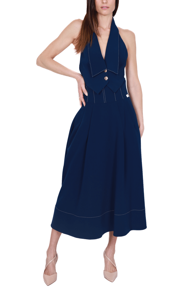 Gilet con revers sciallati e con schiena scoperta, impreziosiscono il capo le impuntura a contrasto e i bottoni dorati
