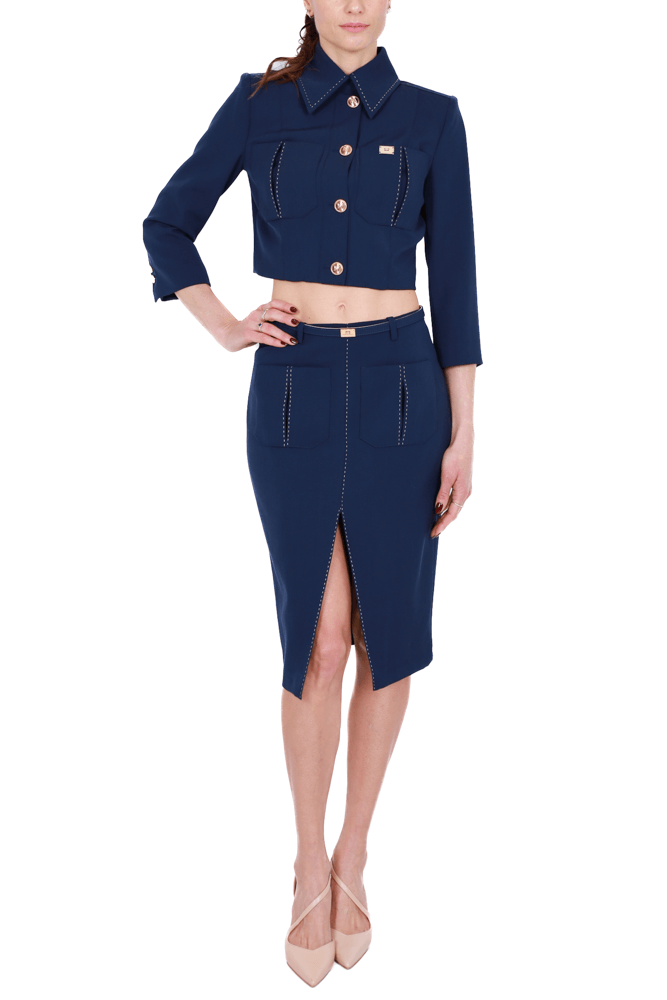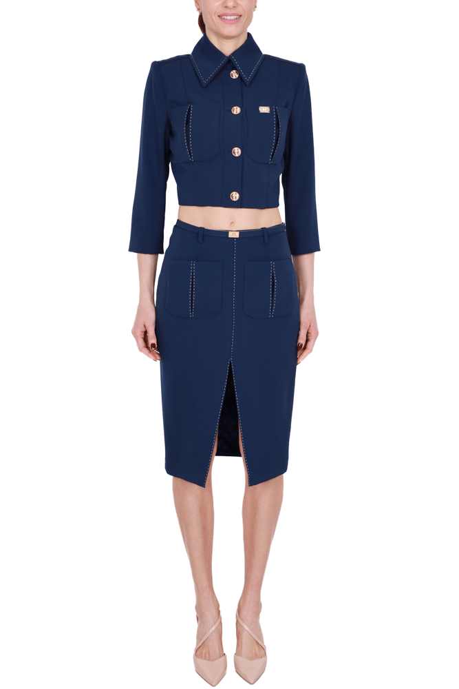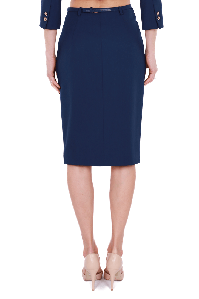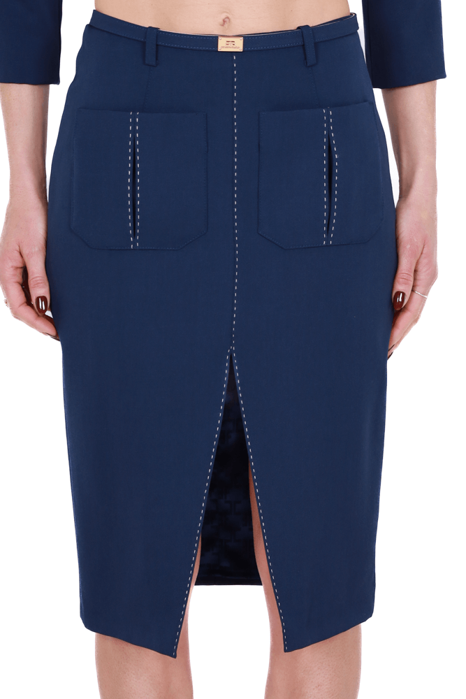 Gonna longuette con spacco centrale e impuntura a contrasto, modello impreziosito da cinturina abbinata
