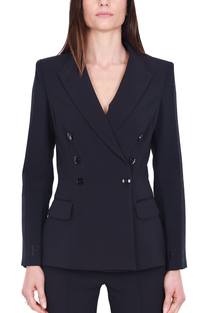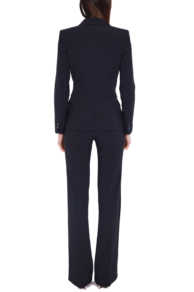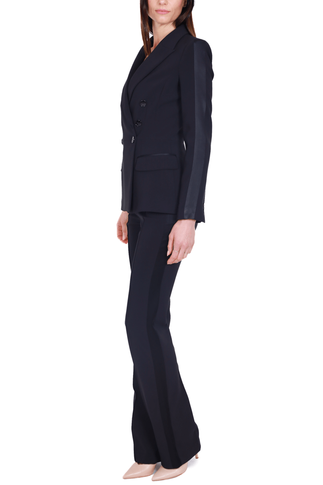 Tailleur in crépe stretch con giacca doppiopetto aderente e pantalone dritto, completo impreziosito da bande in raso ton sur ton