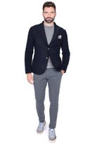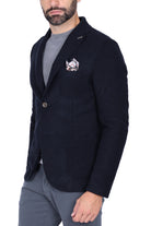 Giacca monopetto da uomo in pregiato tessuto di lana blu navy, sfoderata, con rever classico e chiusura a un bottone. Vestibilità moderna, dotata di tasche laterali applicate e taschino con pochette fantasia coordinata, per un tocco di stile unico. Perfetta per aggiungere eleganza a look casual o formali, si indossa con maglieria o camicia per un outfit ricercato in ogni occasione.