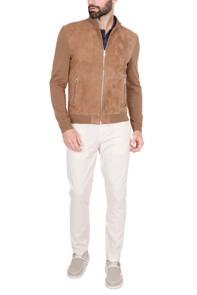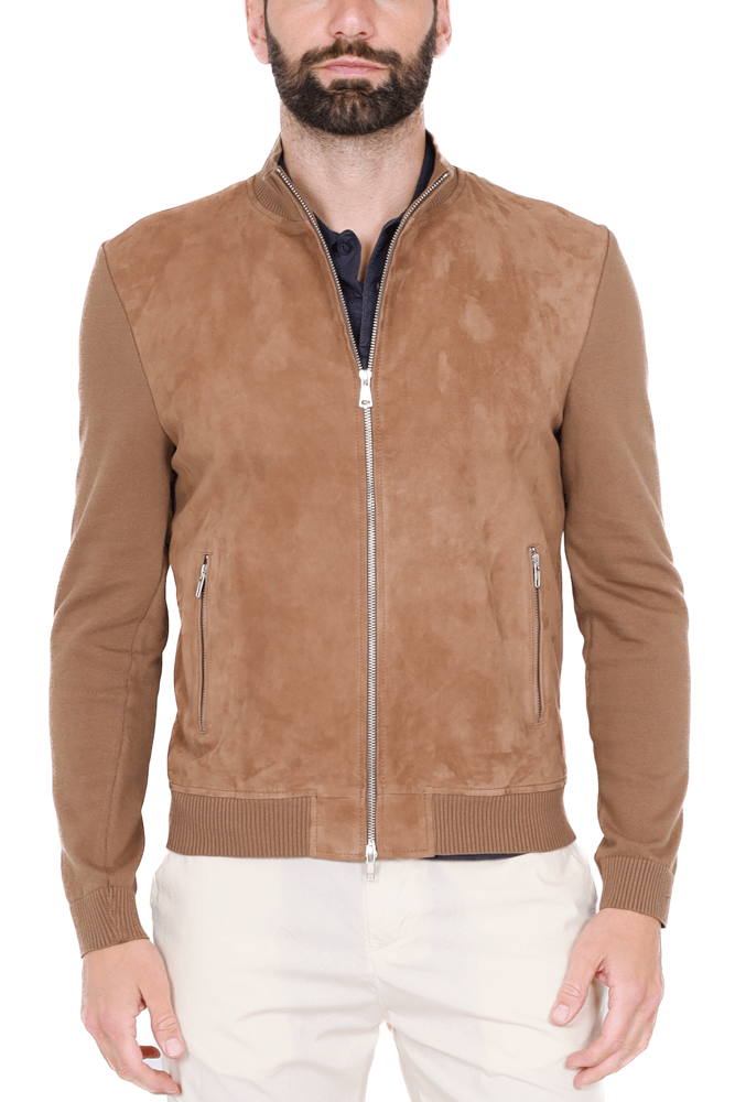 Giubbotto uomo in pelle scamosciata con inserti di maglia, modello stile bomber reinterpretato in chiave moderna per un look sportivo elegante