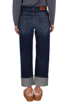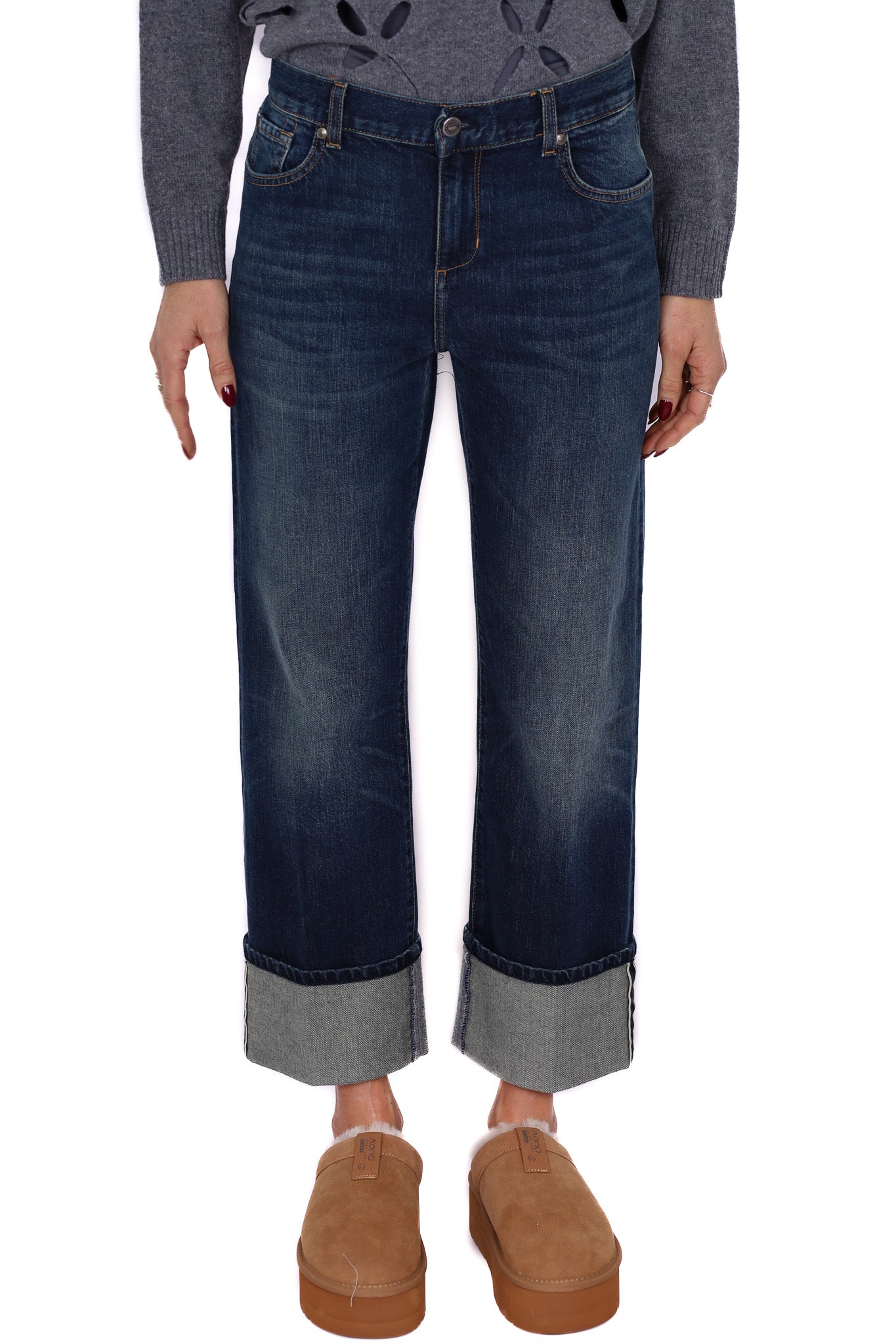 Jeans in denim blu medio, perfetti per look casual dal carattere moderno. La vita è regolare, la gamba dritta morbida con leggere sfumature used su fronte e retro, mentre le tasche posteriori sono arricchite da impunture decorative a contrasto che valorizzano la silhouette.