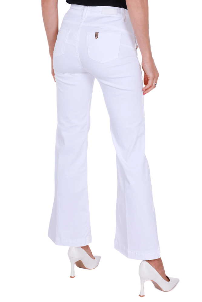 Pantalone a zampa in tela di cotone stretch, modello arricchito da bottoni gioiello sulle tasche