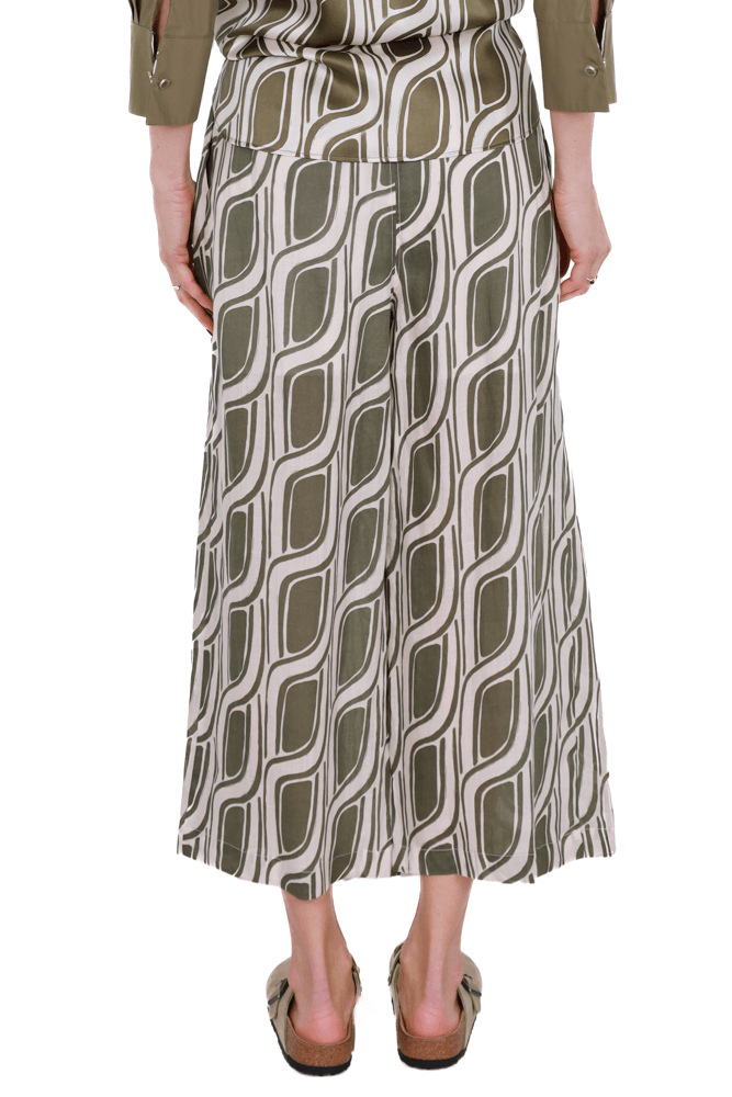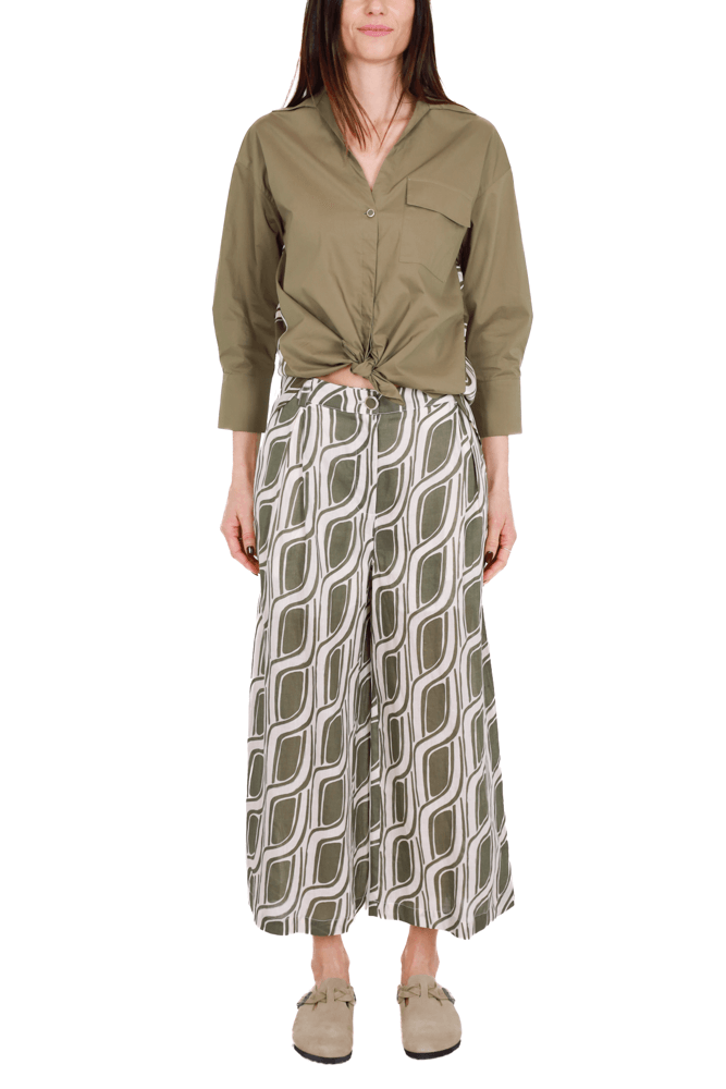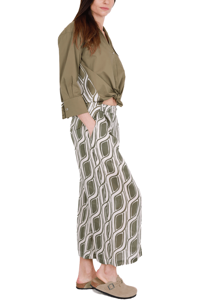 Pantalone a palazzo in fresco tessuto ramié fantasia, modello con elastico in vita sul dietro e tasche a lato