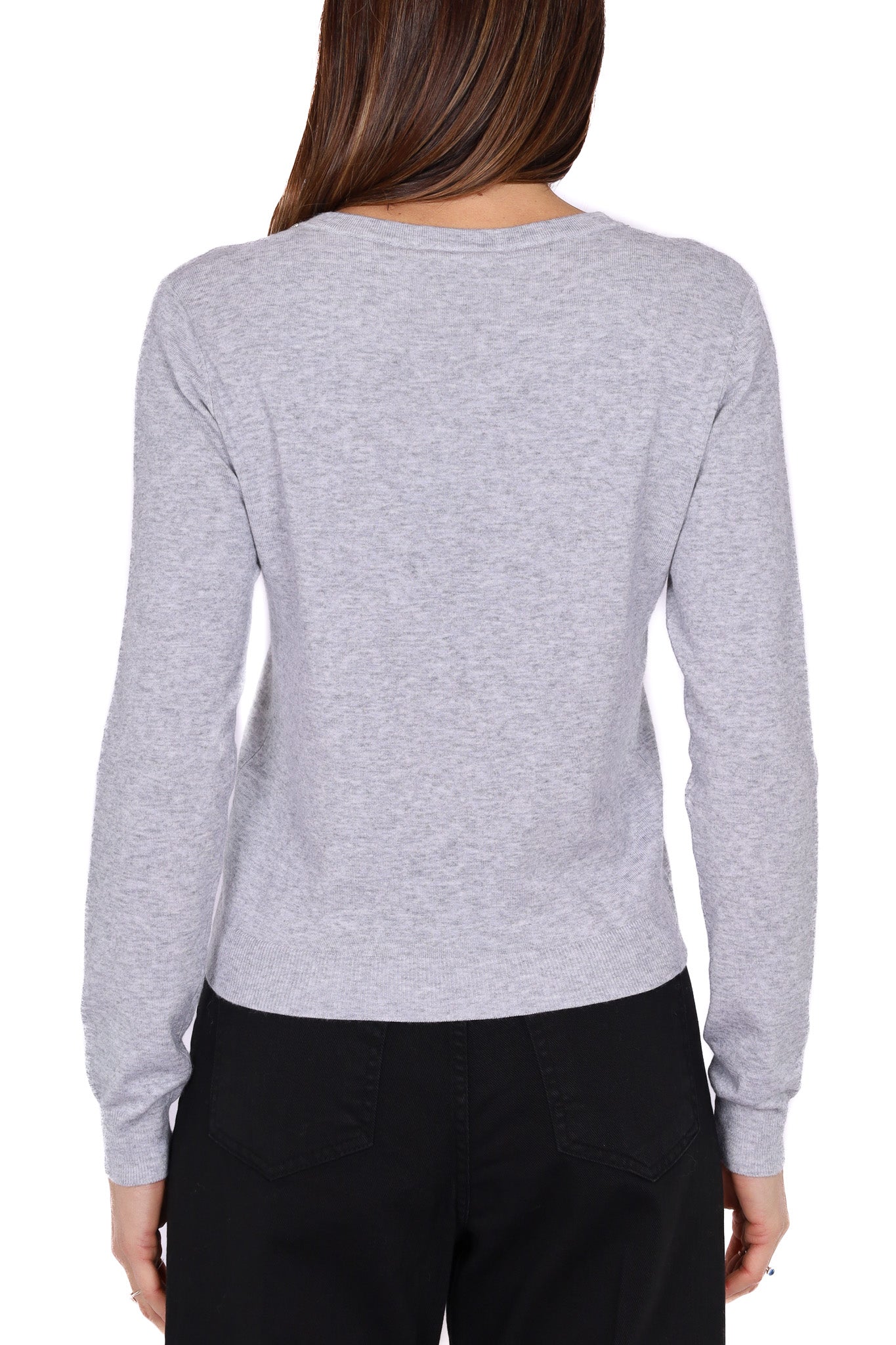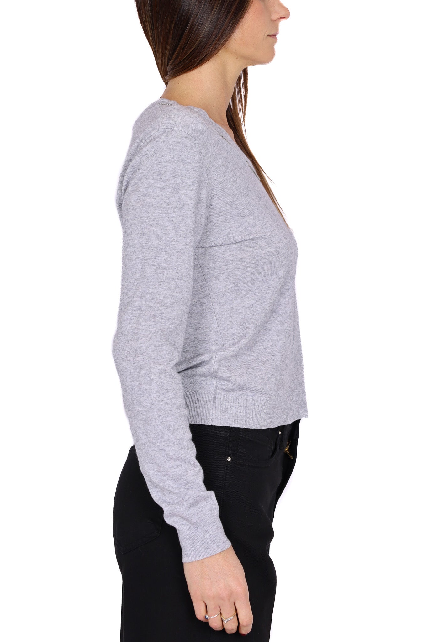 Maglia da donna in filato leggero grigio melange, caratterizzata da uno scollo a V rifinito da una sottile catena metallica color argento che illumina il décolleté e aggiunge un tocco raffinato al look. La linea pulita con maniche lunghe e fondo a costine crea una vestibilità essenziale e femminile.