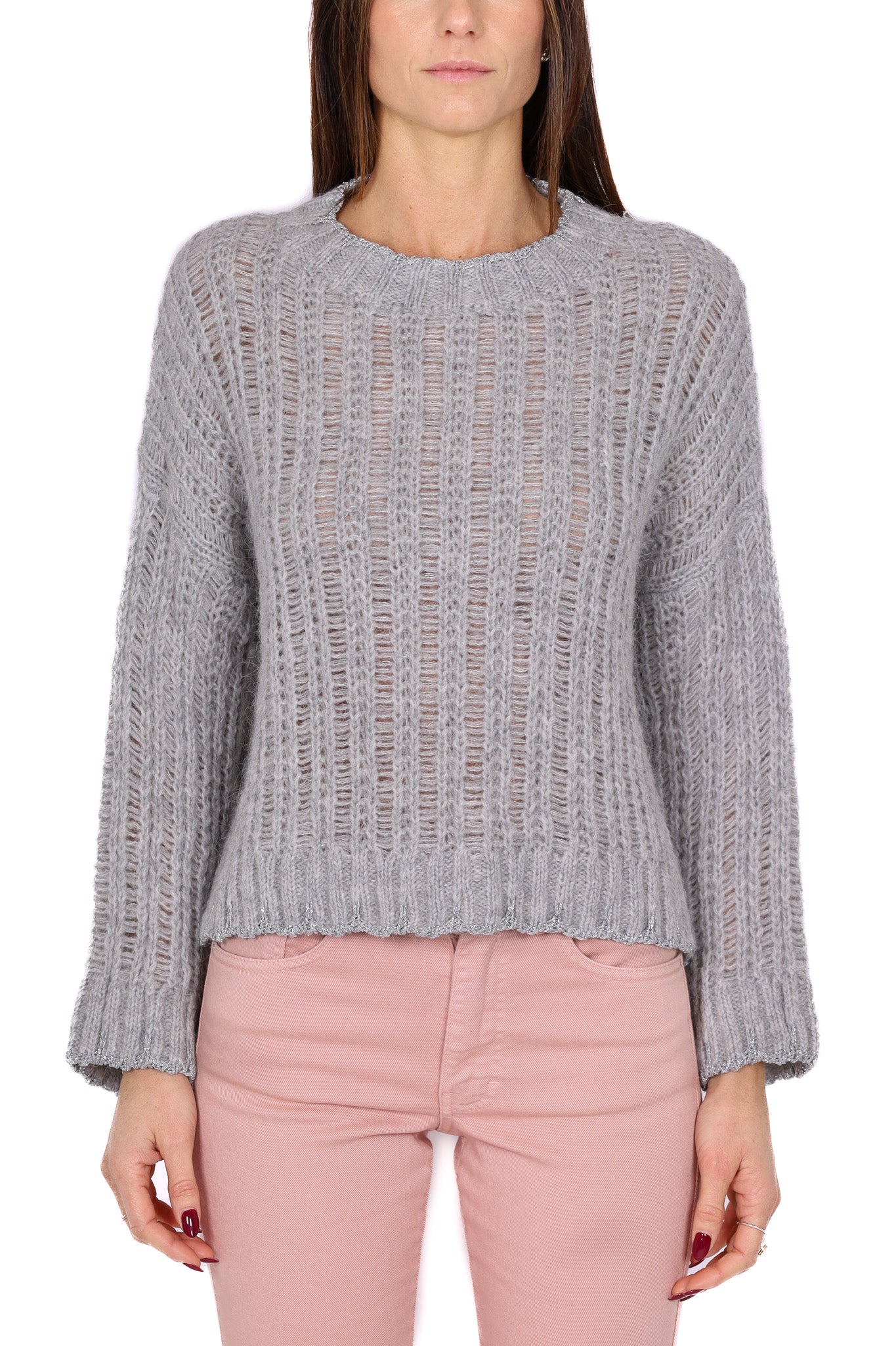 Maglia da donna in filato morbido grigio chiaro dall’effetto leggermente peloso, caratterizzata da una lavorazione traforata verticale che crea un raffinato gioco di trasparenze e dona leggerezza al look. Ideale da indossare con top o bralette a contrasto e pantaloni a vita alta per outfit casual-chic.