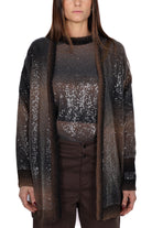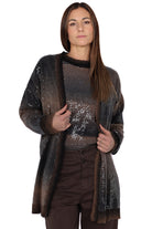 Cardigan lungo aperto in maglia effetto sfumato marrone e nero, impreziosito da una lavorazione di paillettes luminose che donano luce e movimento. Vestibilità morbida, manica lunga, senza bottoni e con bordo rifinito, ideale per essere indossato sopra maglie, top o abiti per un tocco sofisticato day-to-night. Il filato caldo e leggero lo rende perfetto per creare outfit stratificati, casual ma raffinati.