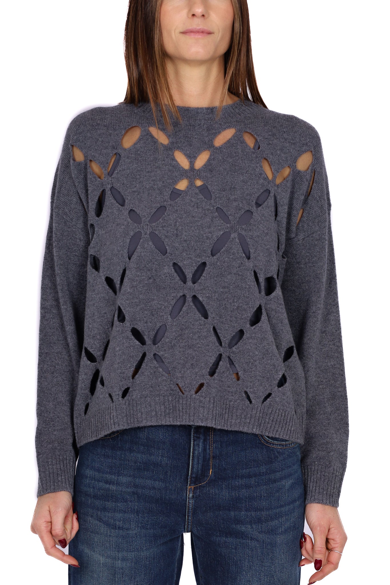 Maglia da donna in morbido filato grigio, caratterizzata da girocollo e maniche lunghe con finiture a costine su polsini e fondo. Il davanti presenta una lavorazione traforata a motivo floreale/romboidale che lascia intravedere il sottostante, ideale da sovrapporre a top o canotte a contrasto per creare giochi di trasparenze dal sapore moderno.