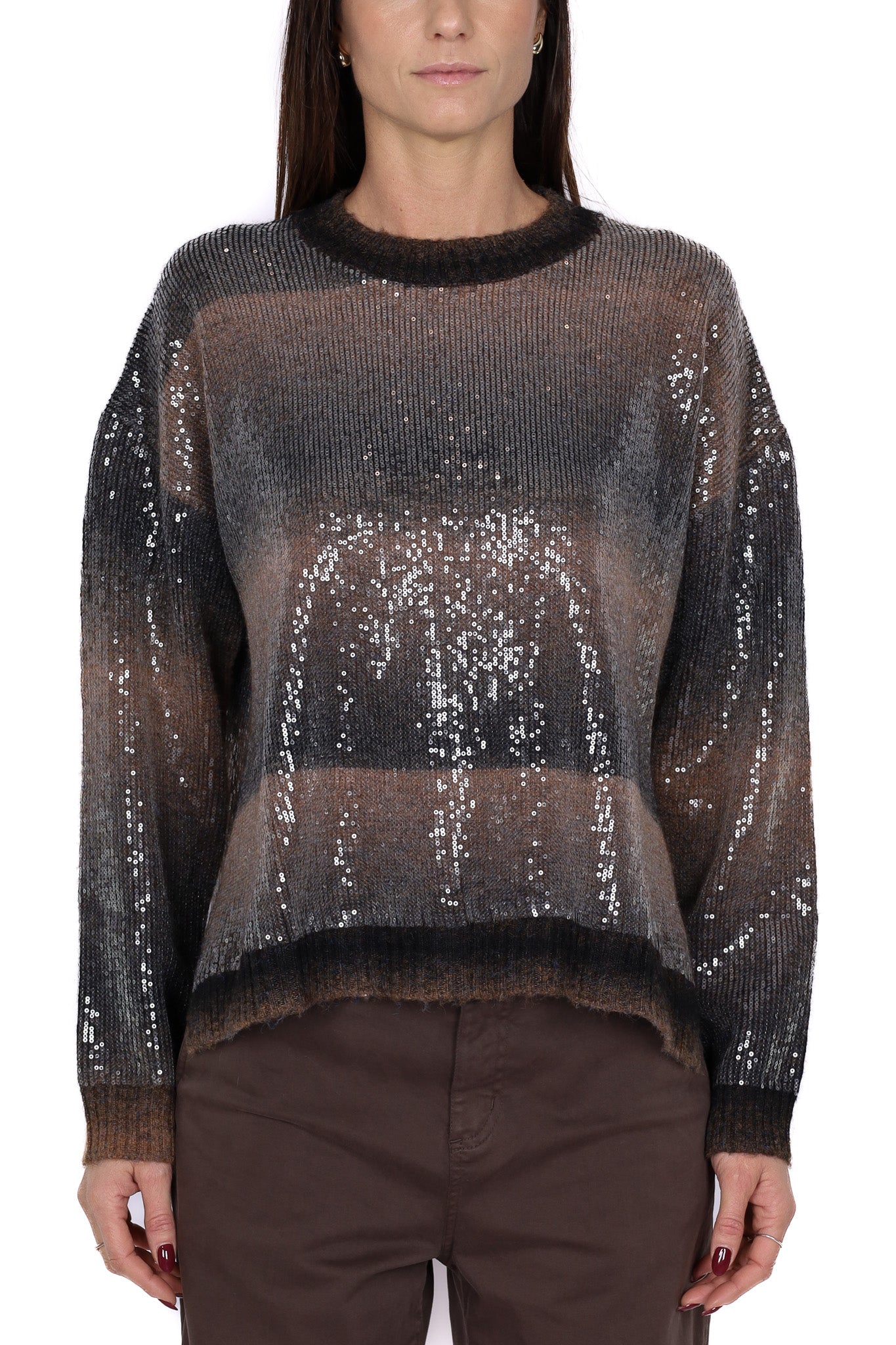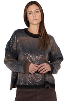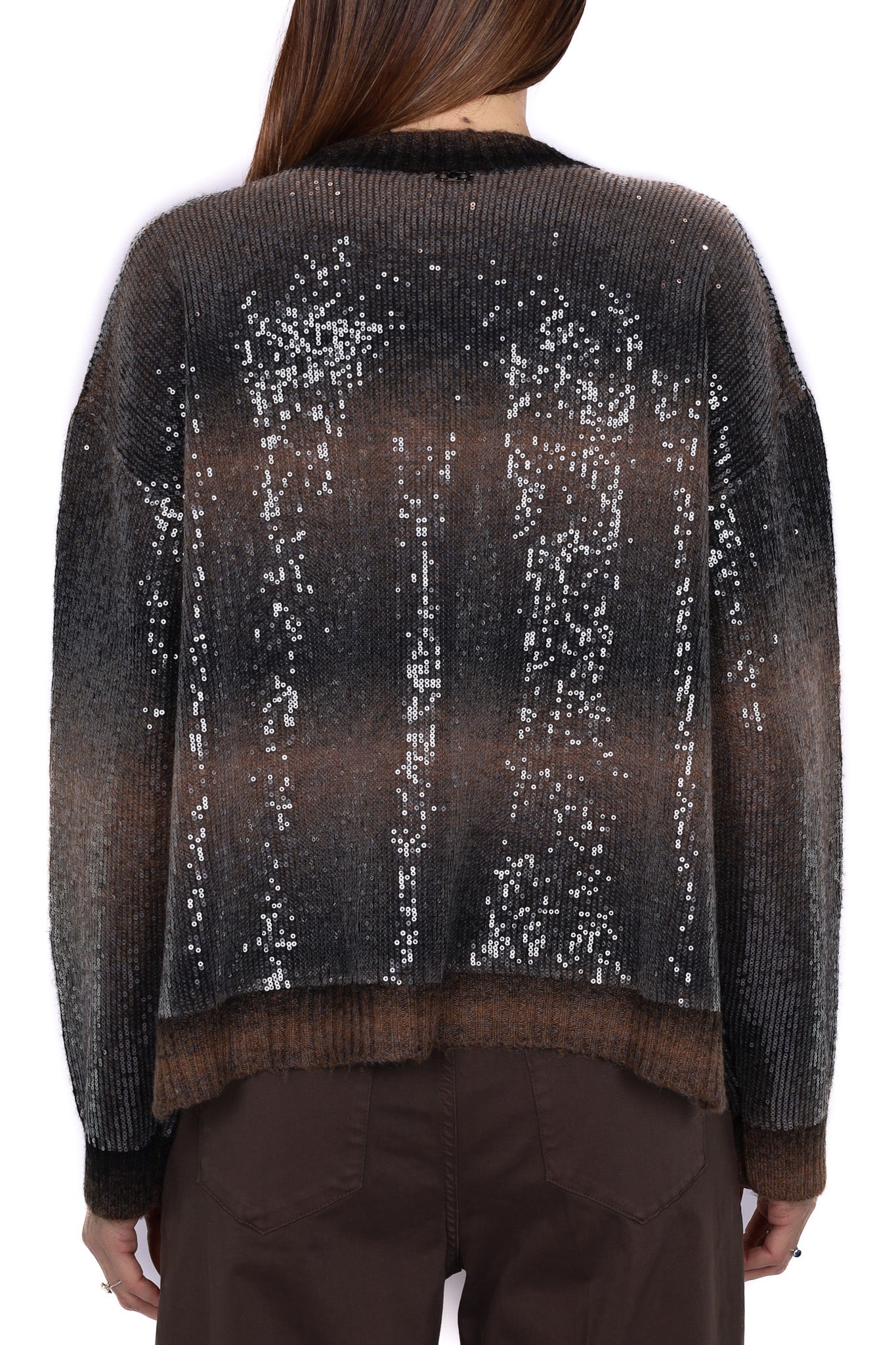 Maglia donna in misto lana con lavorazione effetto sfumato nei toni marrone e nero, arricchita da paillettes luminose su tutta la superficie. Linea dritta, fit boxy e lunghezza che sfiora la vita; girocollo, maniche lunghe e fondo leggermente asimmetrico, per uno stile contemporaneo che valorizza sia outfit casual che look più eleganti.