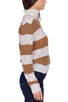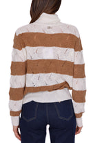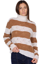 Maglia a girocollo alto realizzata in filato misto, caratterizzata da ampie righe orizzontali beige e panna e da una lavorazione traforata che dona freschezza e leggerezza al tessuto. Il taglio morbido e il fondo a costine la rendono ideale per look casual e rilassati, abbinata a denim o pantaloni neutrali.
