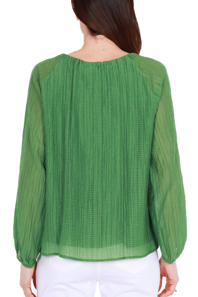 Blusa girocollo in fresco tessuto operato di misto lyocell, modello con laccetto sullo scollo