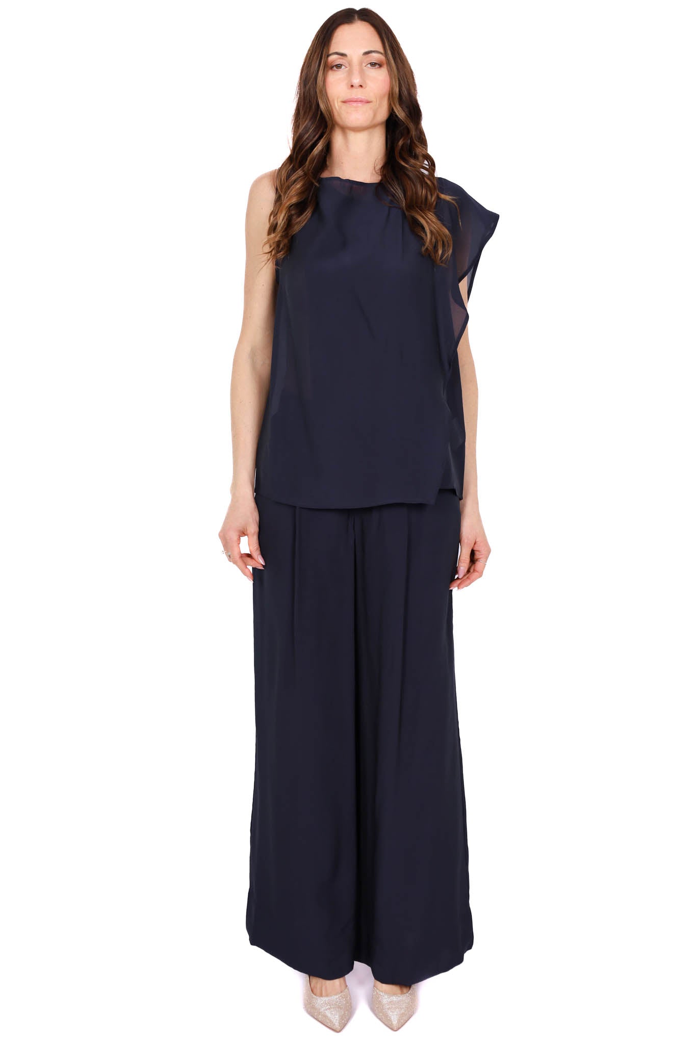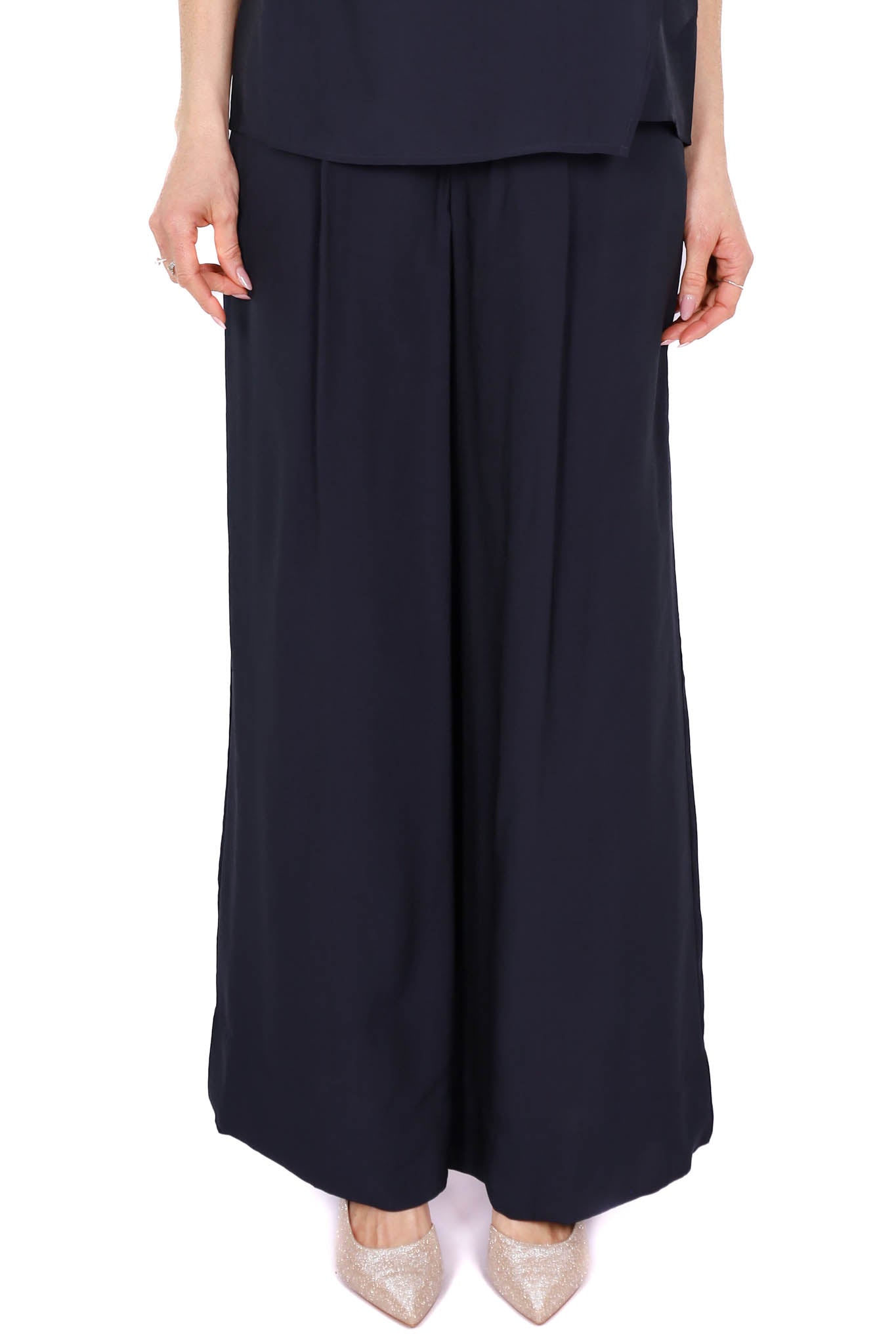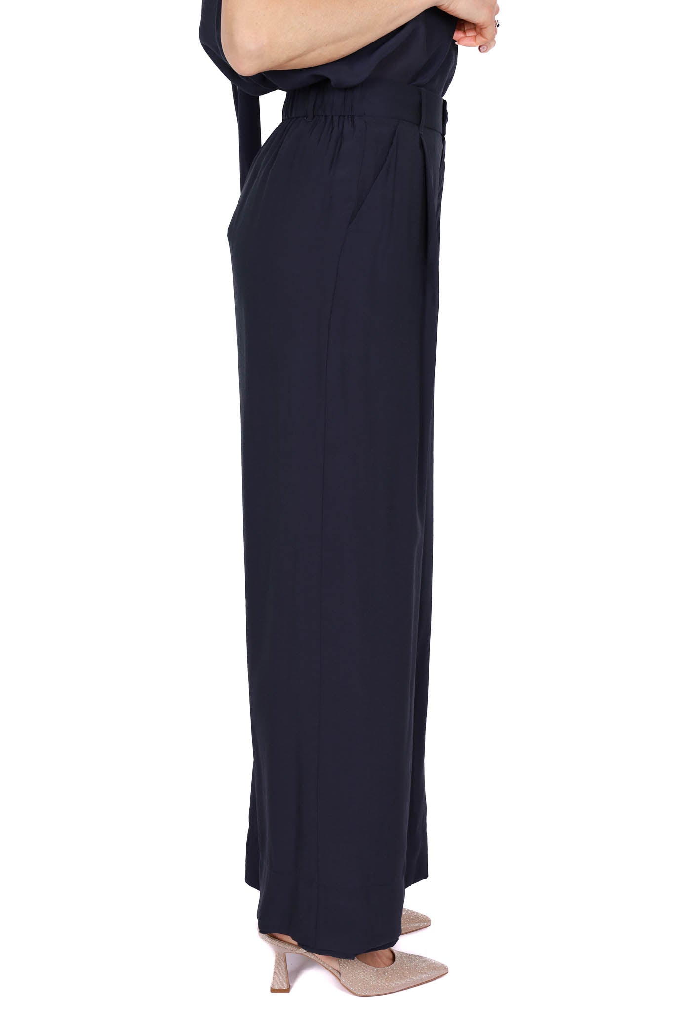 Pantalone da donna modello palazzo in elegante blu, con gamba ampia e linea fluida che dona movimento e comfort. Perfetto per completare outfit eleganti o da cerimonia con stile.
