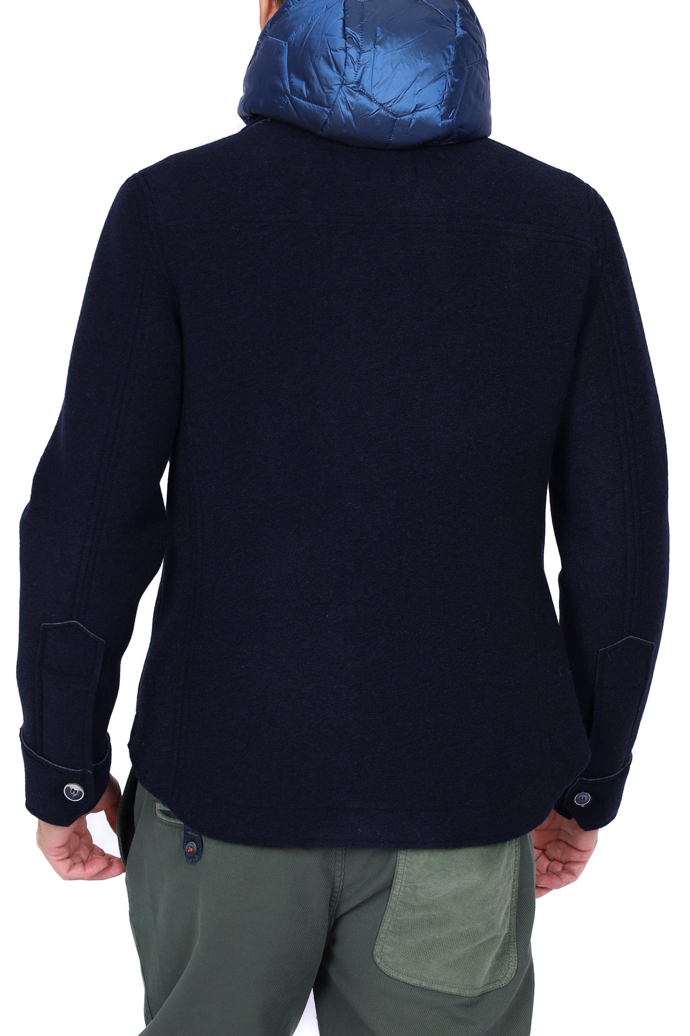 Giacca camicia da uomo in tessuto di lana blu notte, arricchita da cappuccio imbottito e trapuntato removibile per un comfort extra nelle giornate fredde. Dotata di doppia tasca applicata con pattina sul petto, chiusura frontale con bottoni e dettagli sartoriali sulle cuciture. Stile versatile e dinamico, perfetto sia come giubbino leggero che come sovracamicia dal gusto contemporaneo.