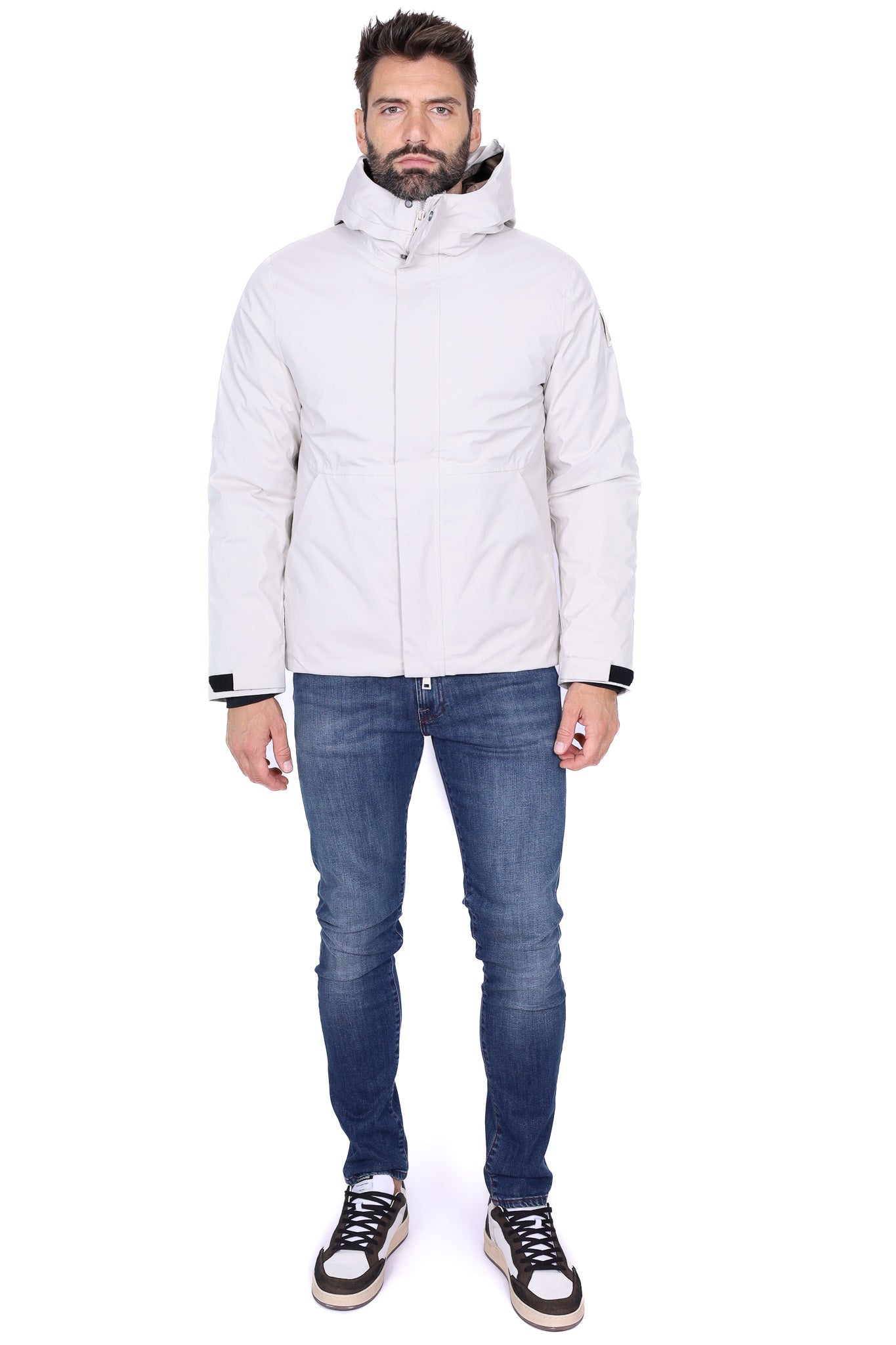 Giubbotto imbottito da uomo realizzato in tessuto tecnico bianco ottico, con cappuccio fisso e chiusura frontale con zip e bottoni automatici a scomparsa. Design essenziale, linea regolare, presenta polsi regolabili con velcro e dettagli curati. Imbottitura calda e leggera, ideale per affrontare la stagione fredda sia in città che nel tempo libero.