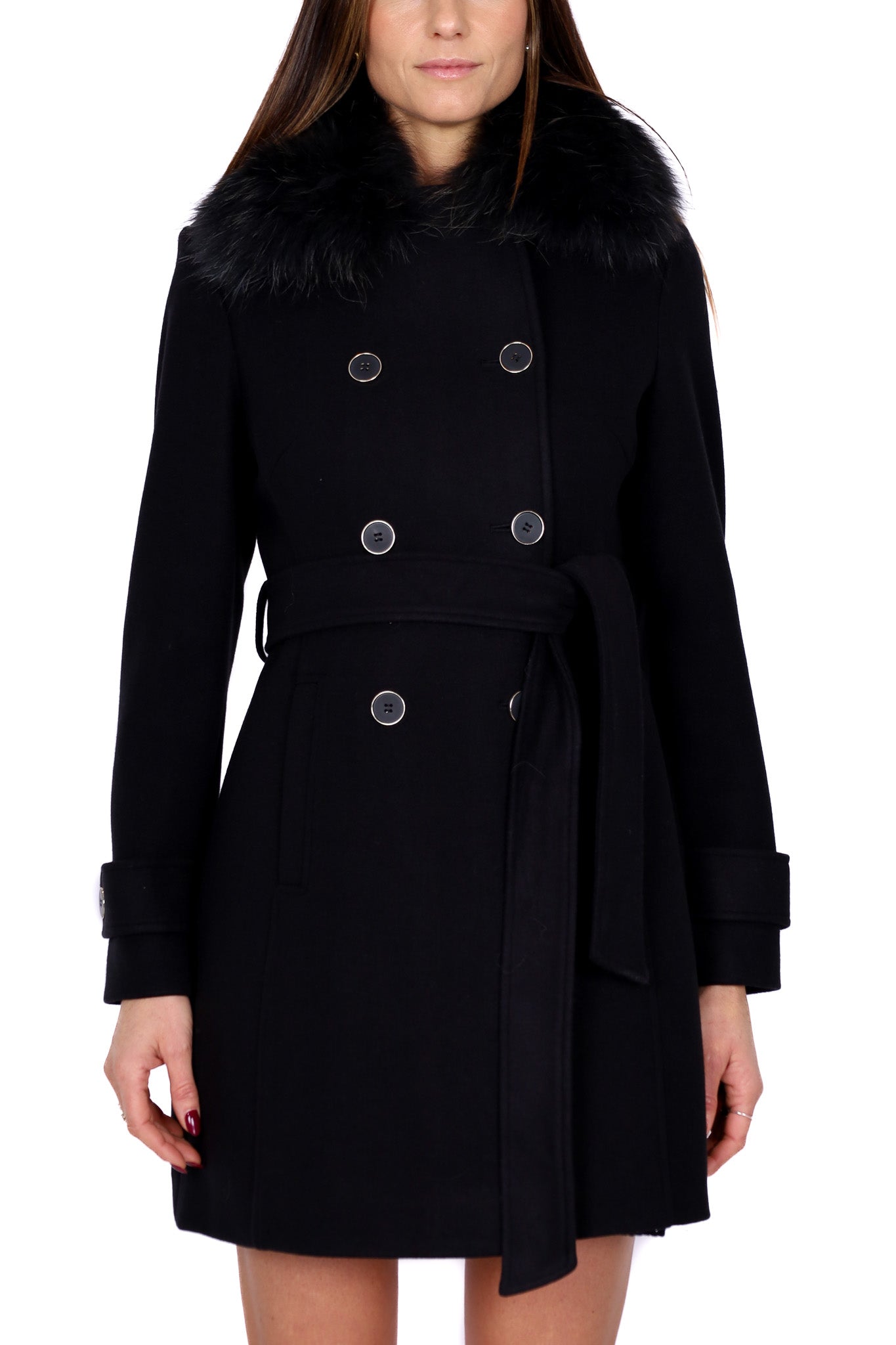 Cappotto doppiopetto con collo in eco-pelliccia nero