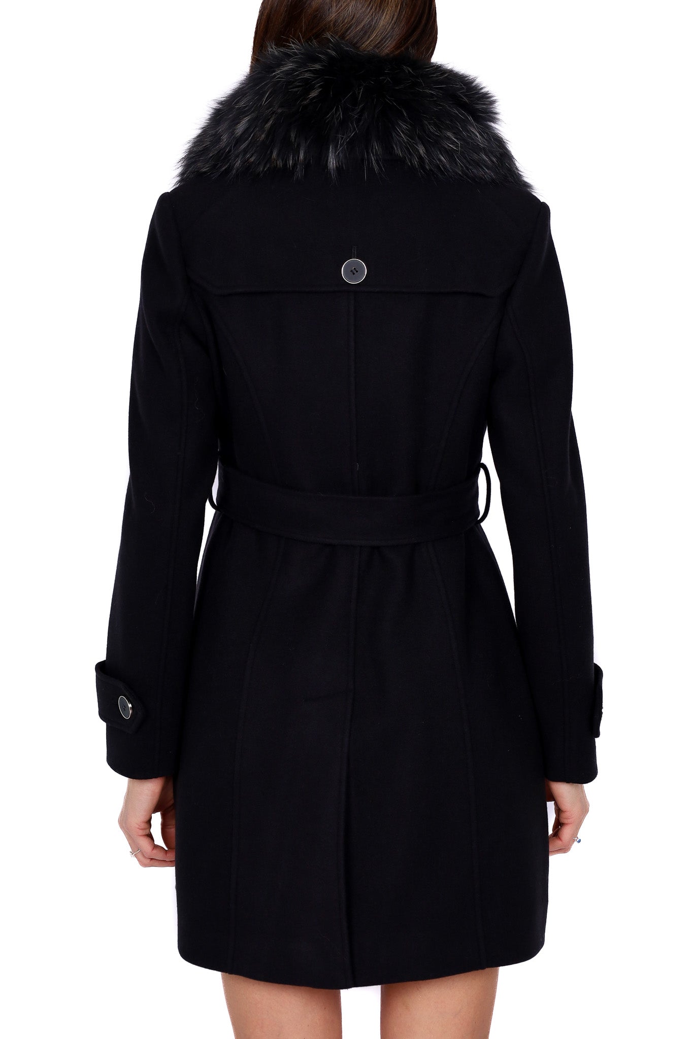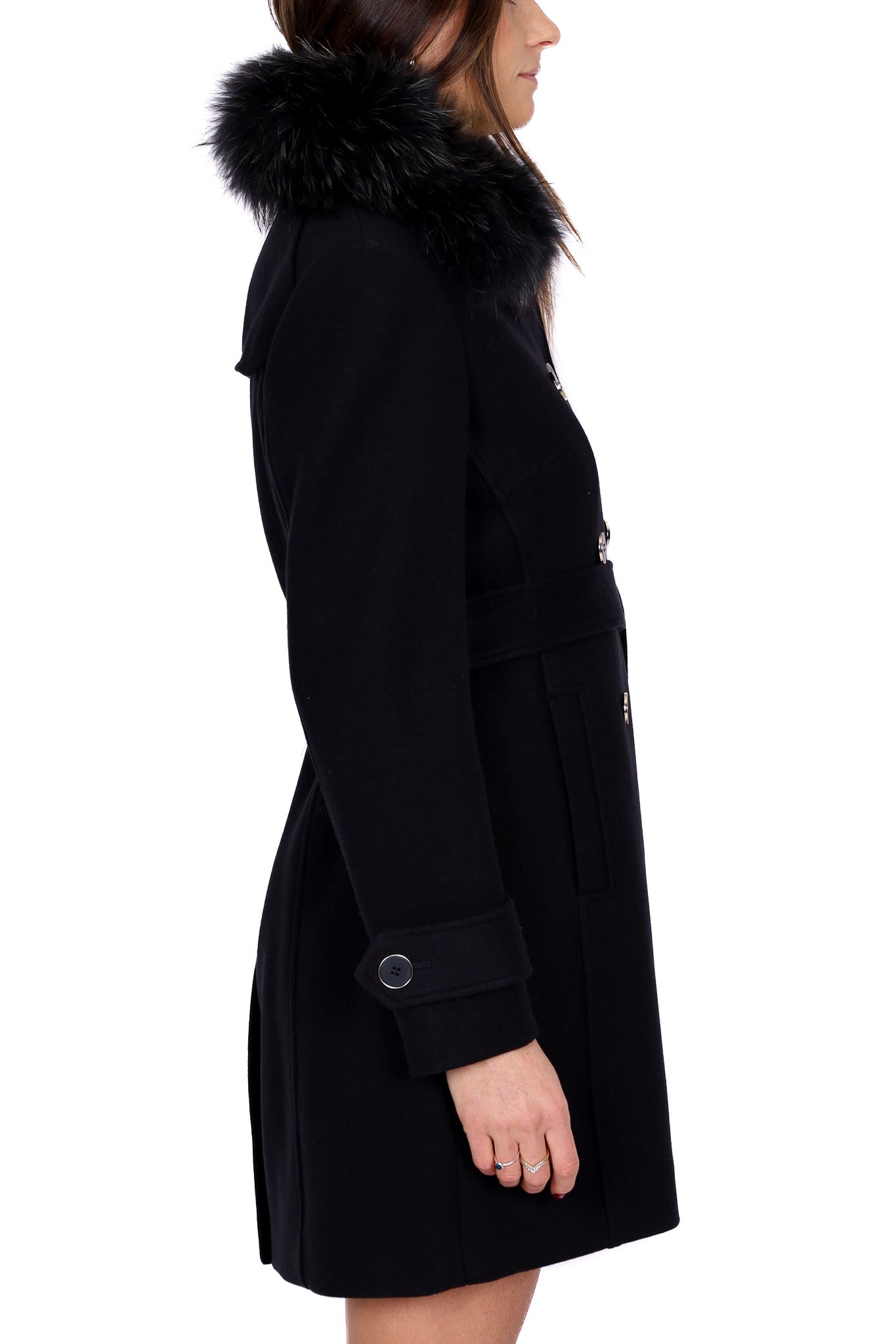 Cappotto donna corto doppiopetto in tessuto di lana nero con cintura in vita e dettagli rifiniti. Caratterizzato da un ampio collo in eco-pelliccia nera removibile, chiusura con bottoni e profili sul polso con alamaro. Ideale per aggiungere un tocco elegante e caldo al guardaroba invernale, da abbinare sia ad outfit casual che più formali.