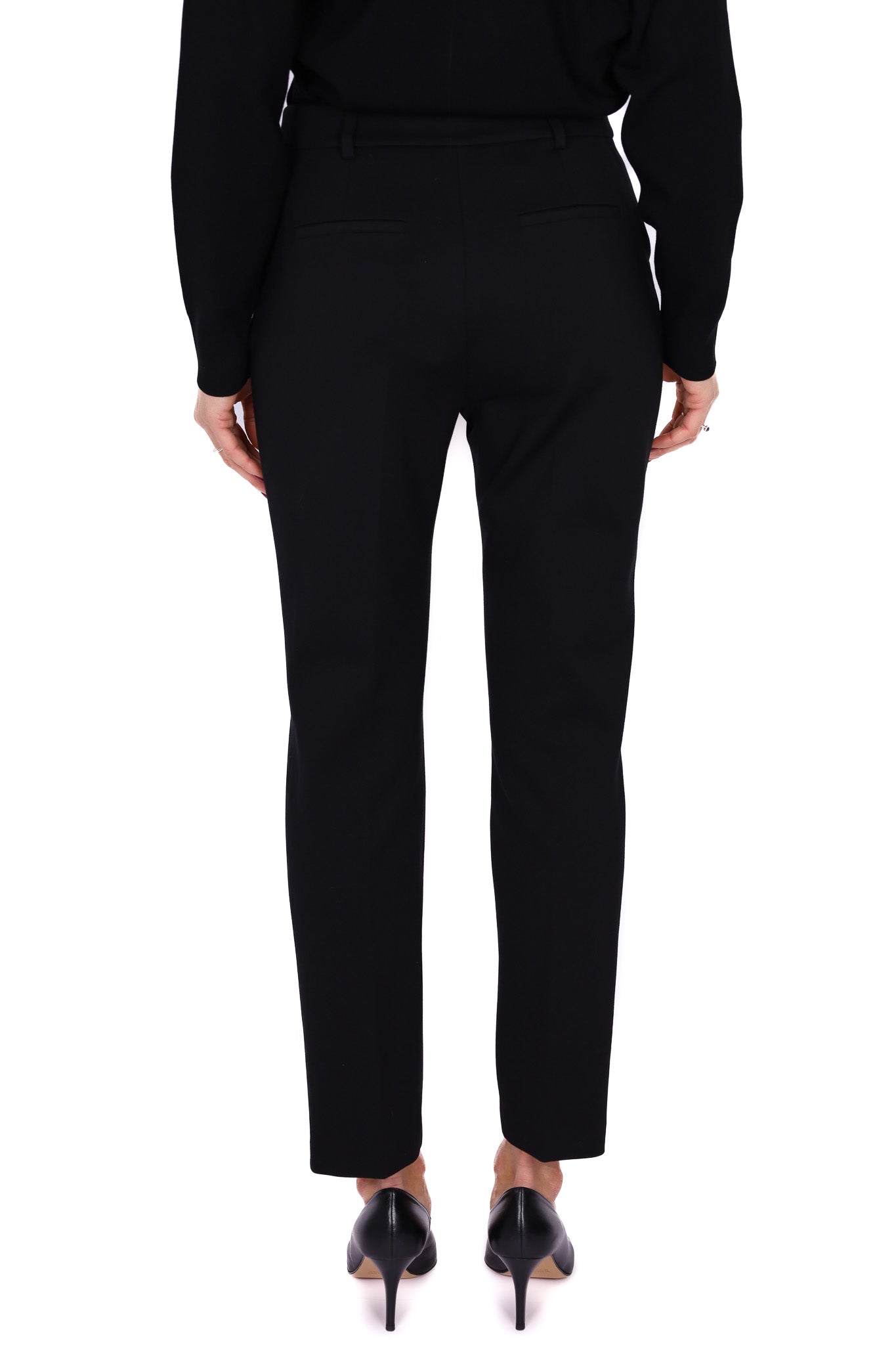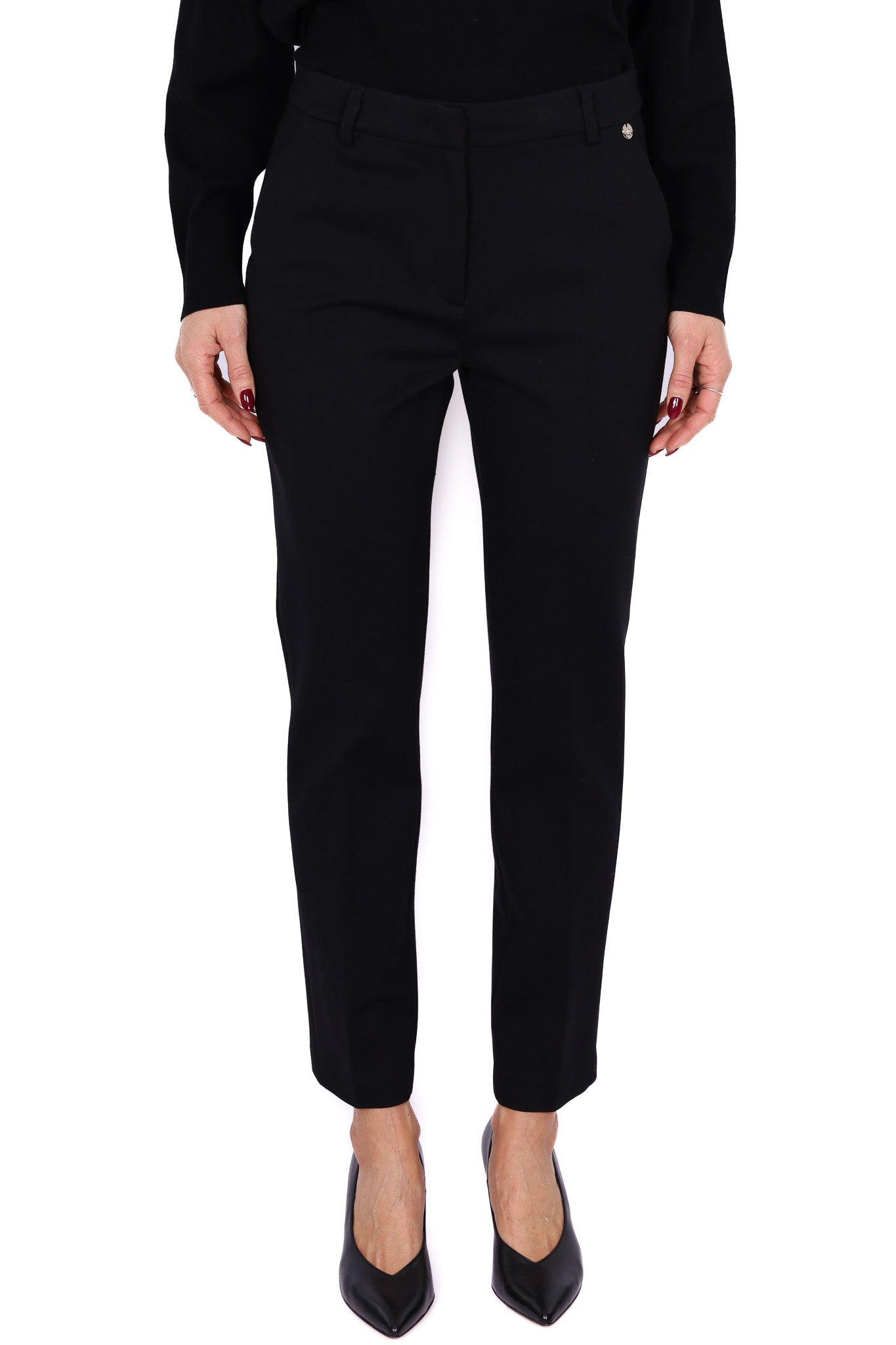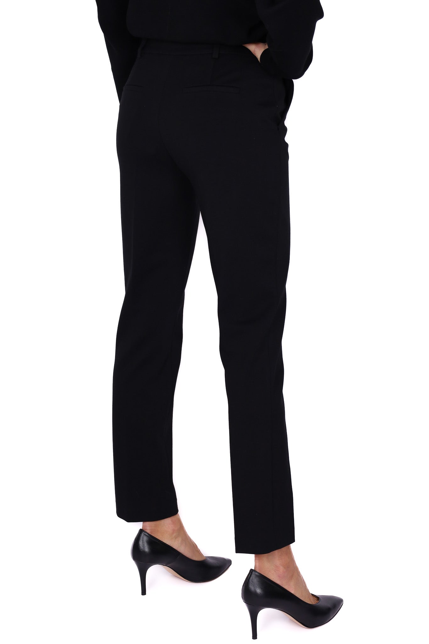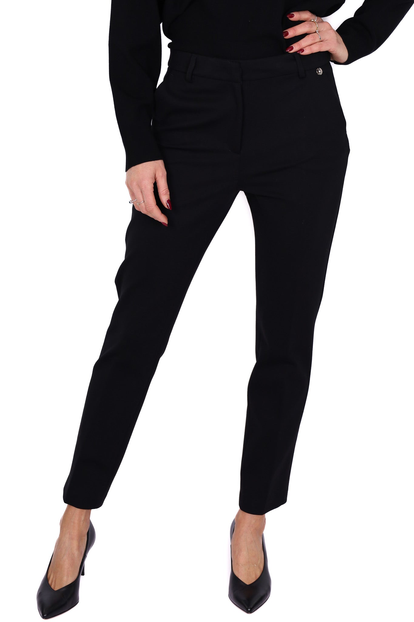 Pantaloni da donna in tessuto nero stretch con linea dritta, vita regolare e passanti per cintura. Chiusura frontale con zip e gancio, tasche laterali alla francese e tasche a filetto sul retro per un look elegante ma pratico. Ideali da indossare in ufficio, per occasioni formali o per completare un outfit minimal chic: la semplicità delle linee valorizza la figura ed è perfetta sia con décolleté che con mocassini o sneakers.