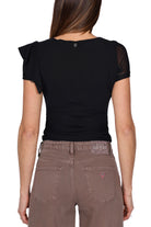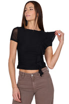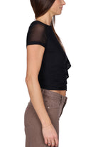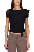 Top da donna in jersey stretch nero, dal design pulito con scollo rotondo e maniche corte in tulle leggermente trasparente che donano leggerezza e femminilità al capo. Sul davanti un morbido volant applicato in diagonale scende dal fianco verso il fondo creando movimento e slanciando la figura senza appesantire il look, perfetto da abbinare a jeans o pantaloni a vita alta per outfit minimal-chic da giorno e da sera.