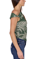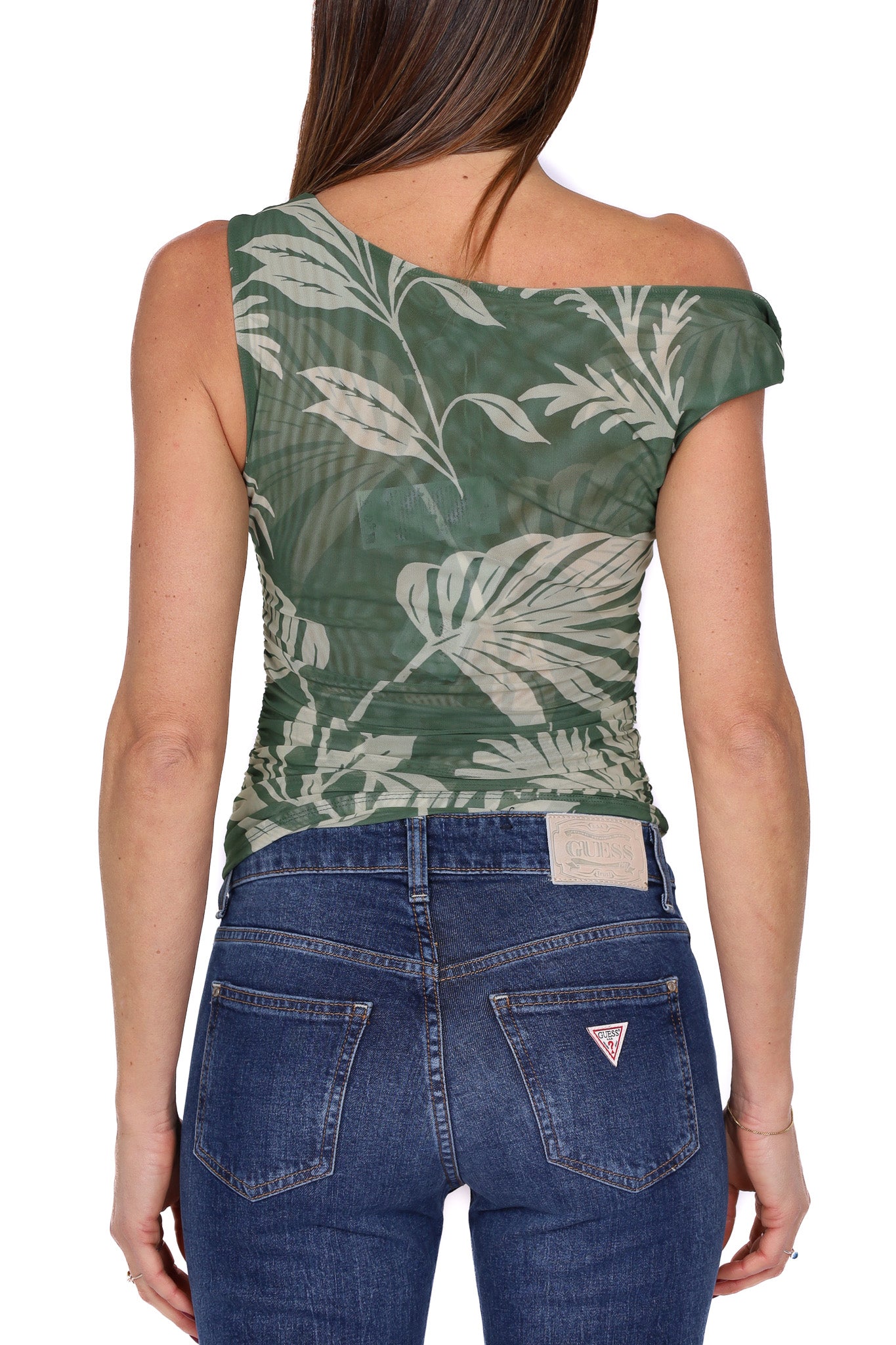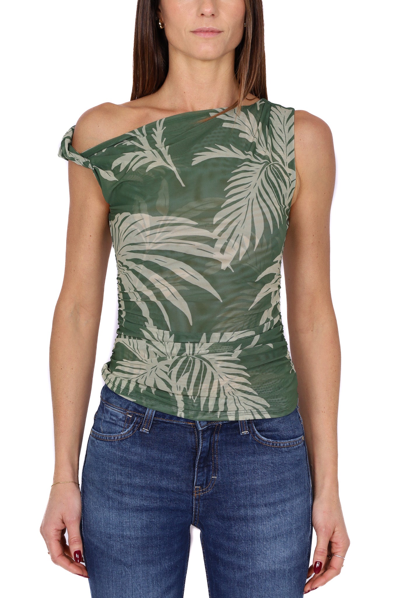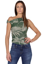 Top da donna in tulle elasticizzato semi-trasparente verde con stampa foglie tono chiaro all over, caratterizzato da un elegante scollo monospalla che lascia scoperta una spalla e incornicia il décolleté in modo femminile e contemporaneo. La linea è leggermente aderente con piccole arricciature laterali che avvolgono la figura e slanciano la silhouette senza appesantire il look, perfetta da abbinare a jeans o pantaloni a vita alta per outfit minimal-chic a tema tropicale, dal giorno alla sera.