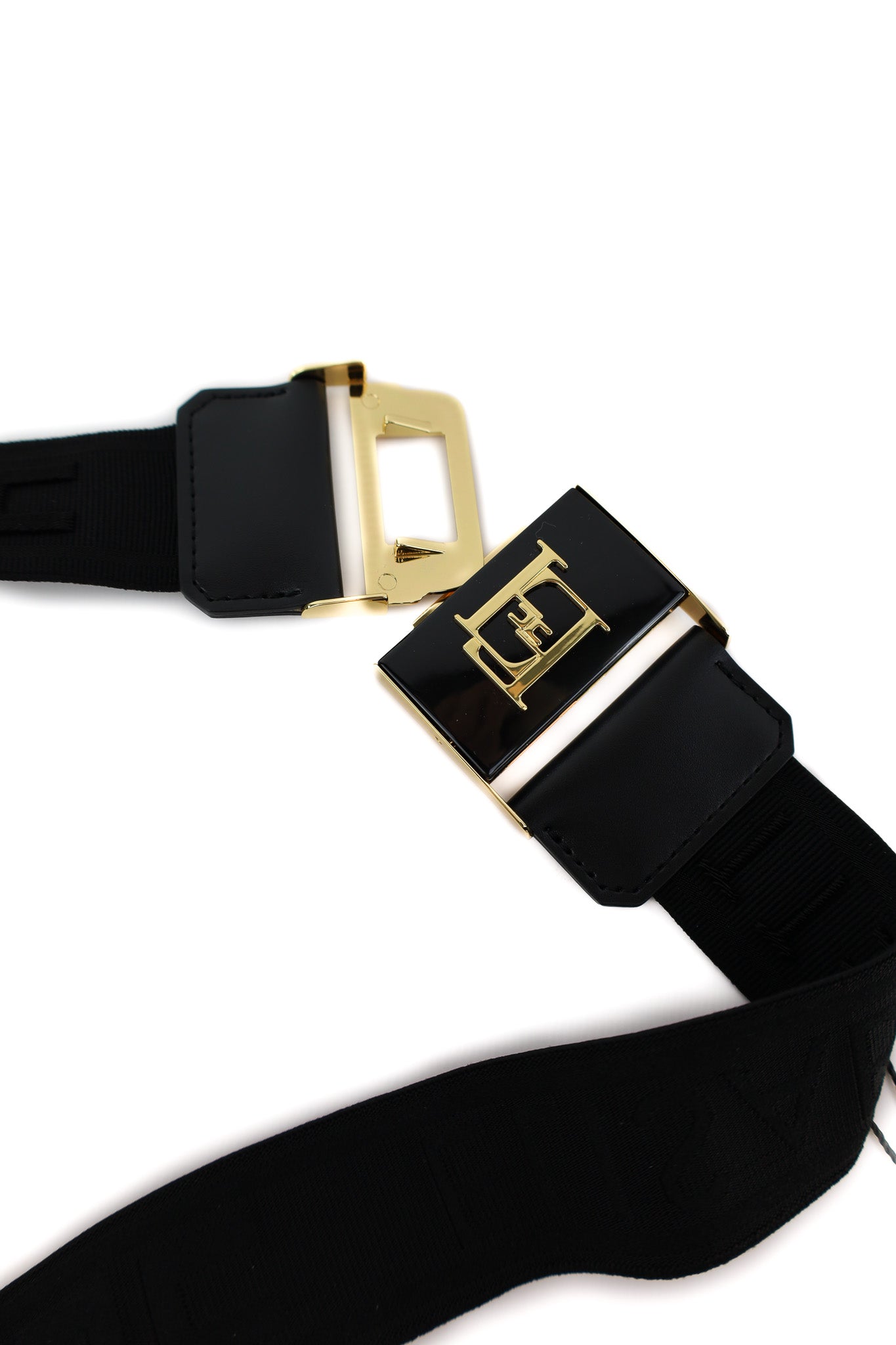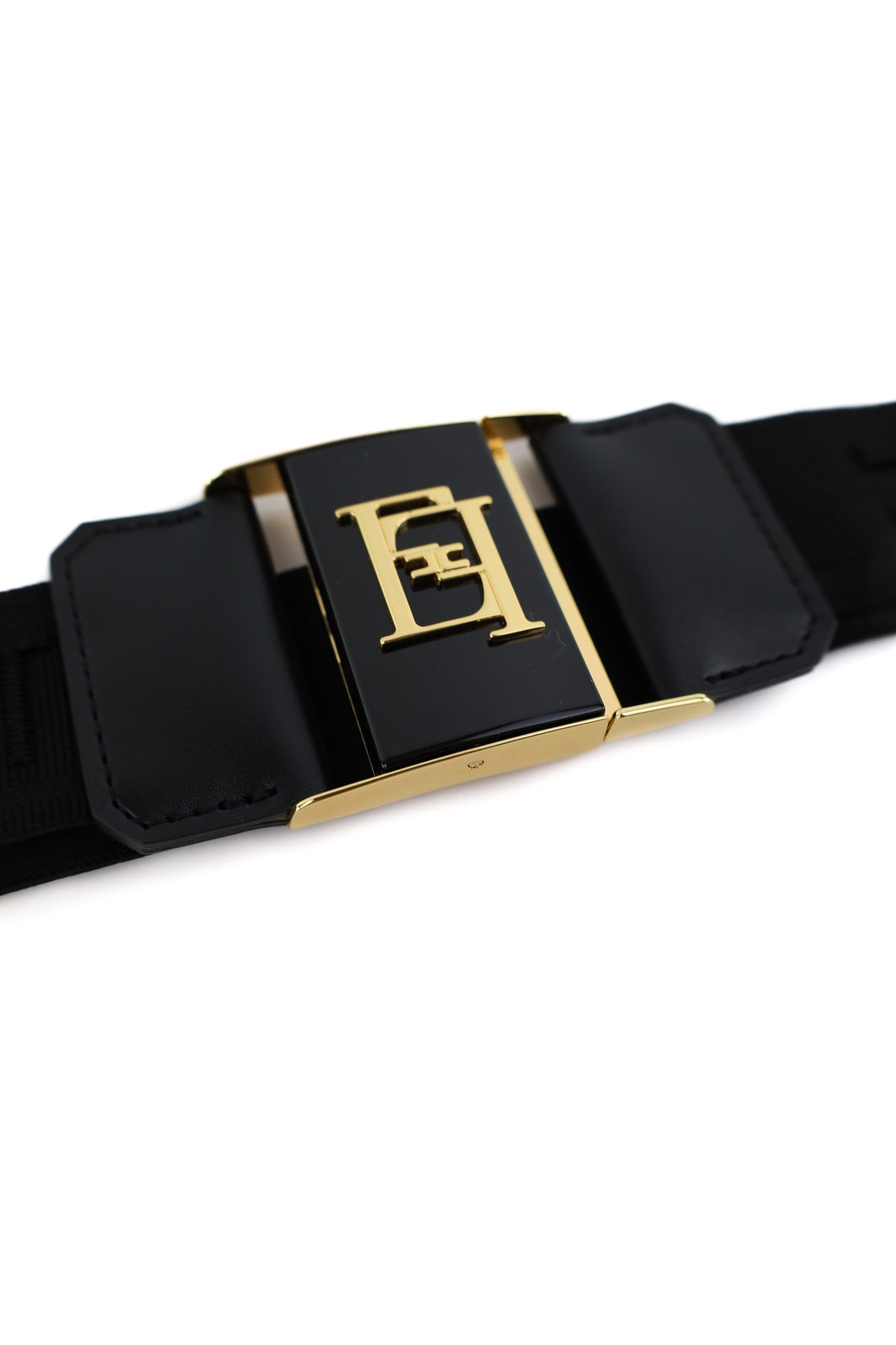 Cintura da donna in tessuto elastico nero con inserti in pelle. Pensata per segnare il punto vita su abiti, cappotti e maglie grazie alla struttura stretch che si adatta comodamente alla silhouette. Il sistema di chiusura frontare, a incastro in metallo dorato, rende la cintura pratica da indossare.