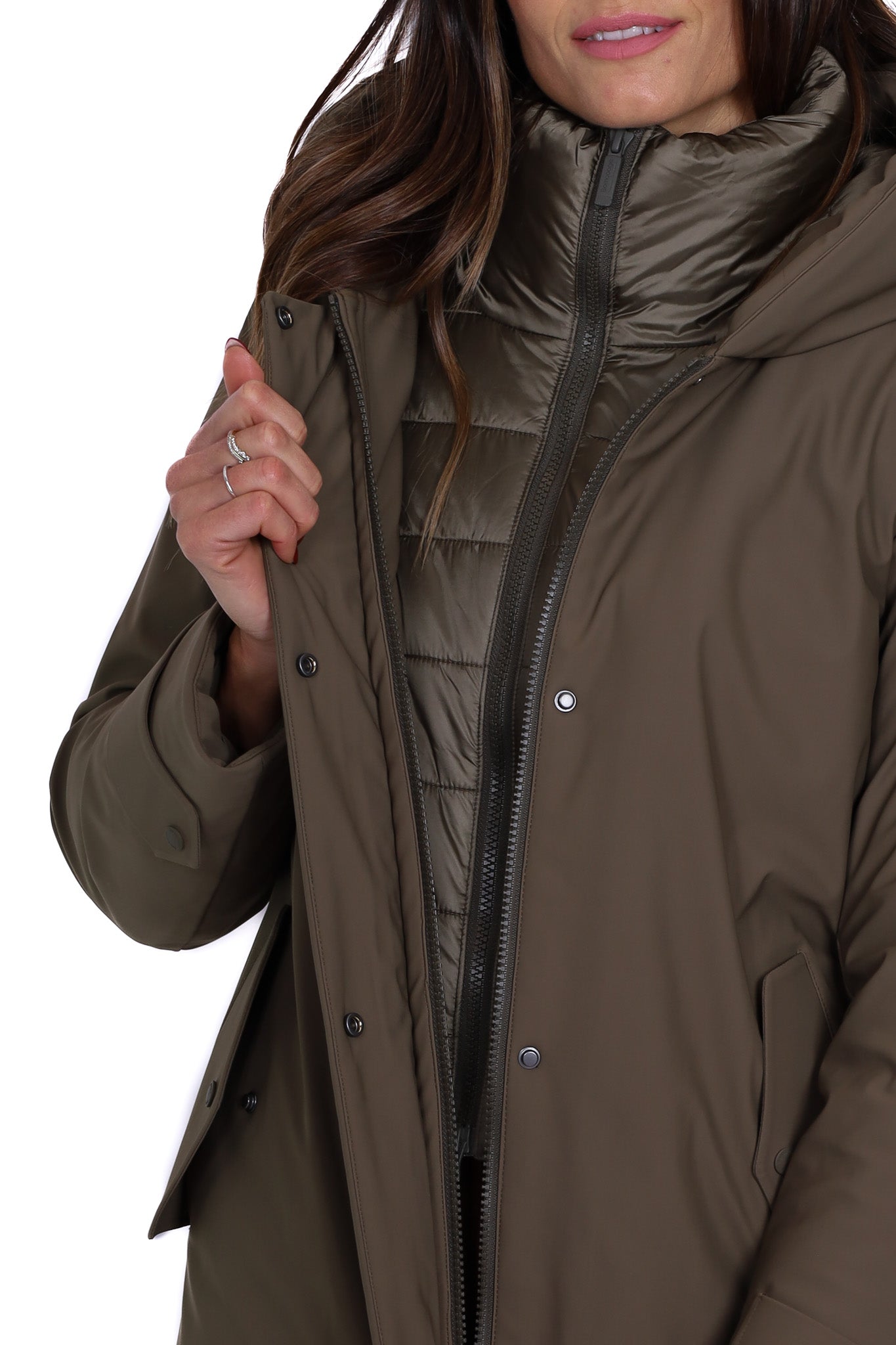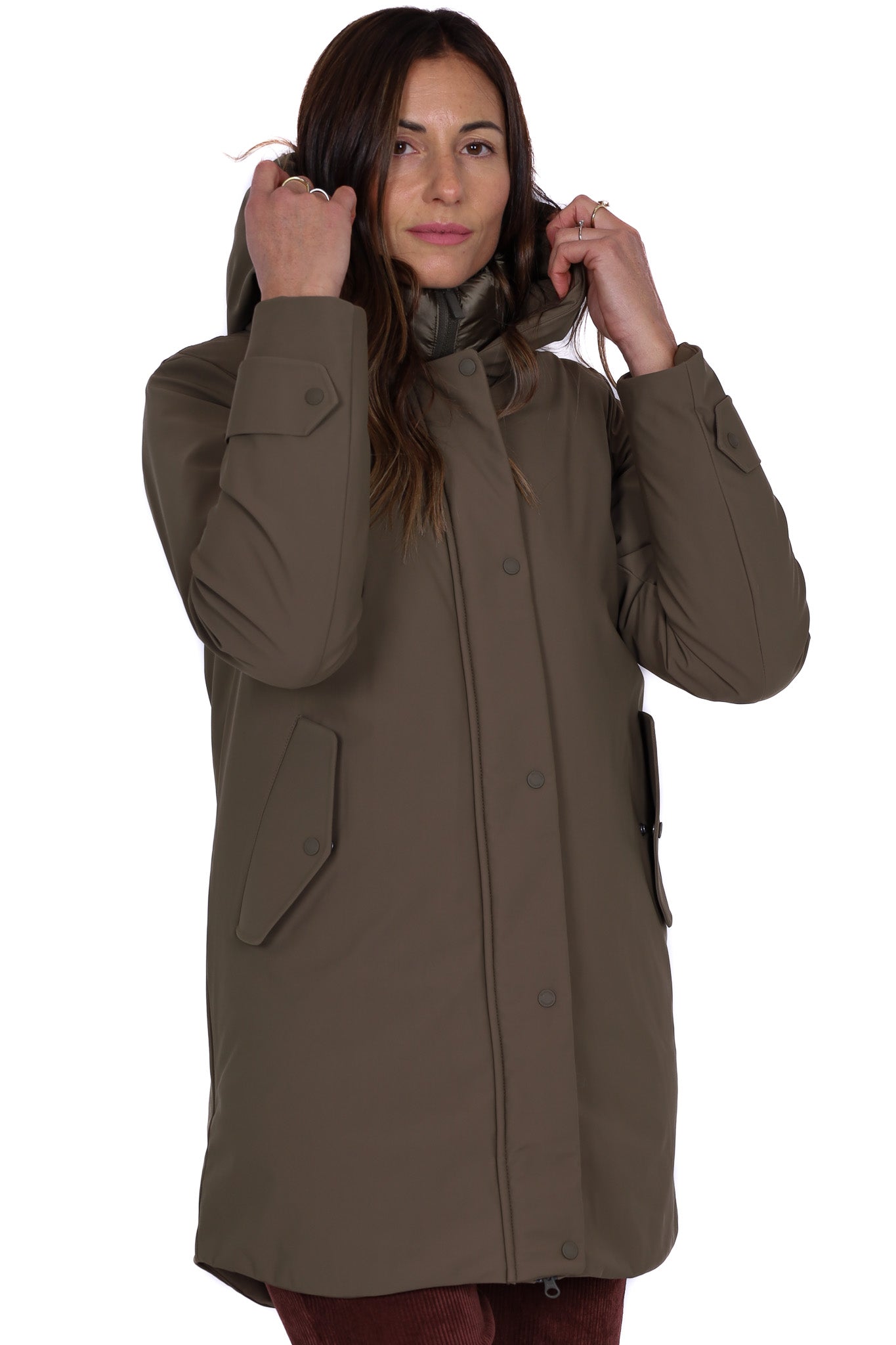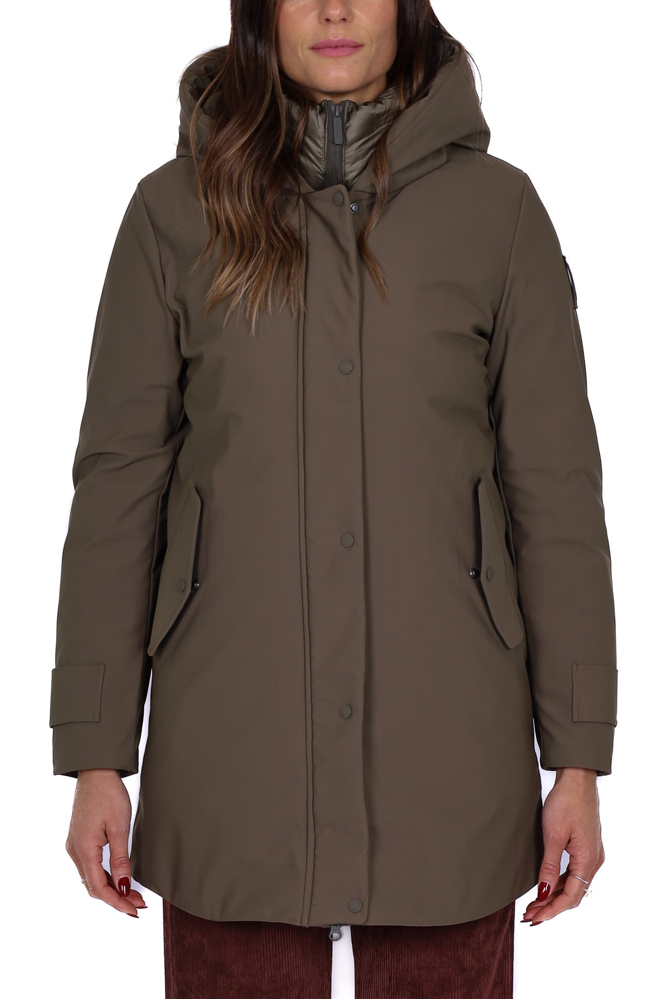 Parka donna imbottito di colore verde kaki con cappuccio fisso. Chiusura frontale con zip a doppio cursore e patta con bottoni automatici, tasche laterali con pattina e polsini regolabili con alamaro. Linea dritta e lunghezza a metà coscia, ideale per affrontare i mesi più freddi con stile e comfort. Vestibilità regular, lunga sul fondo.