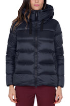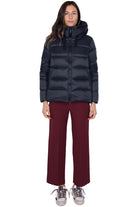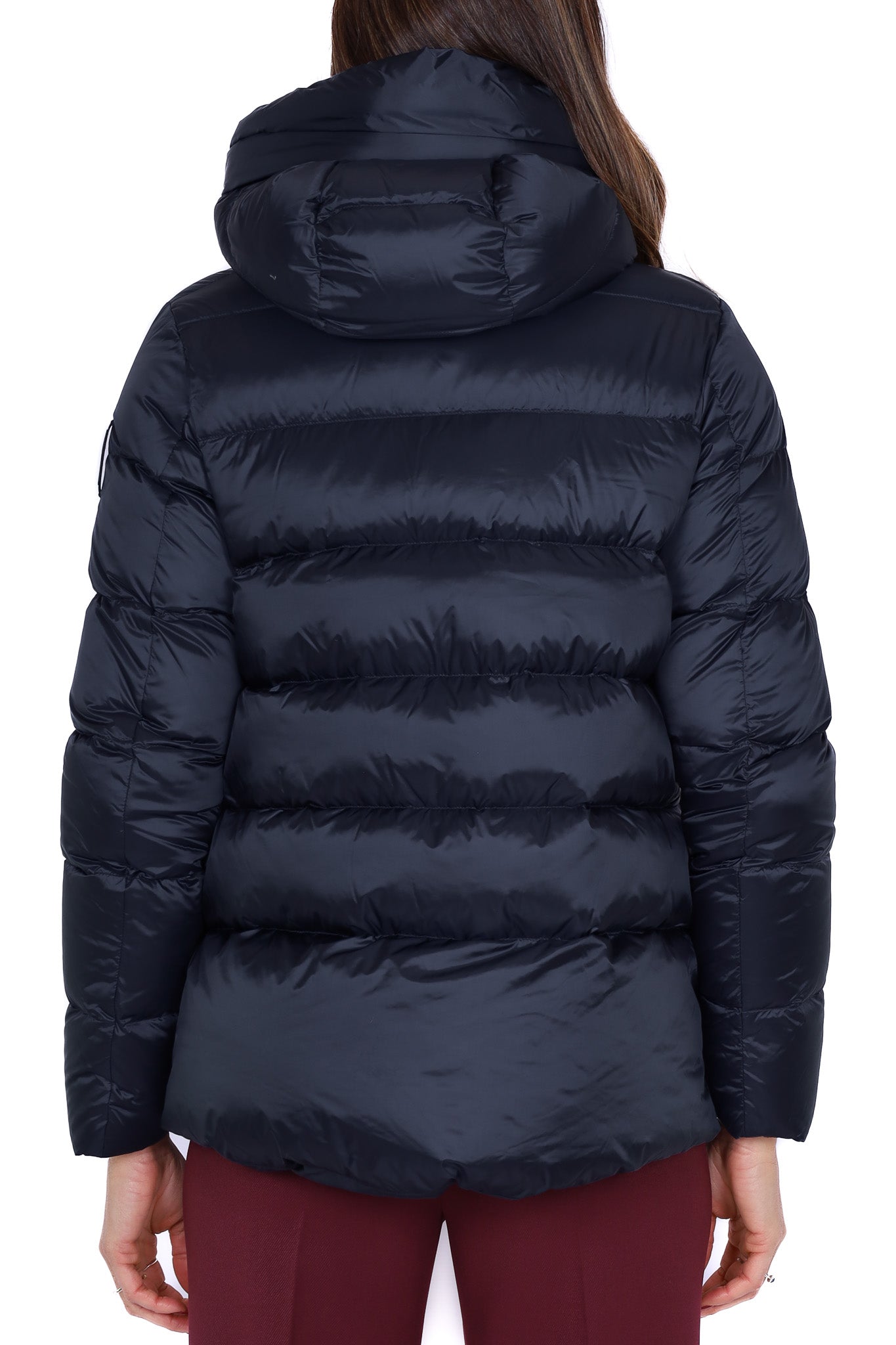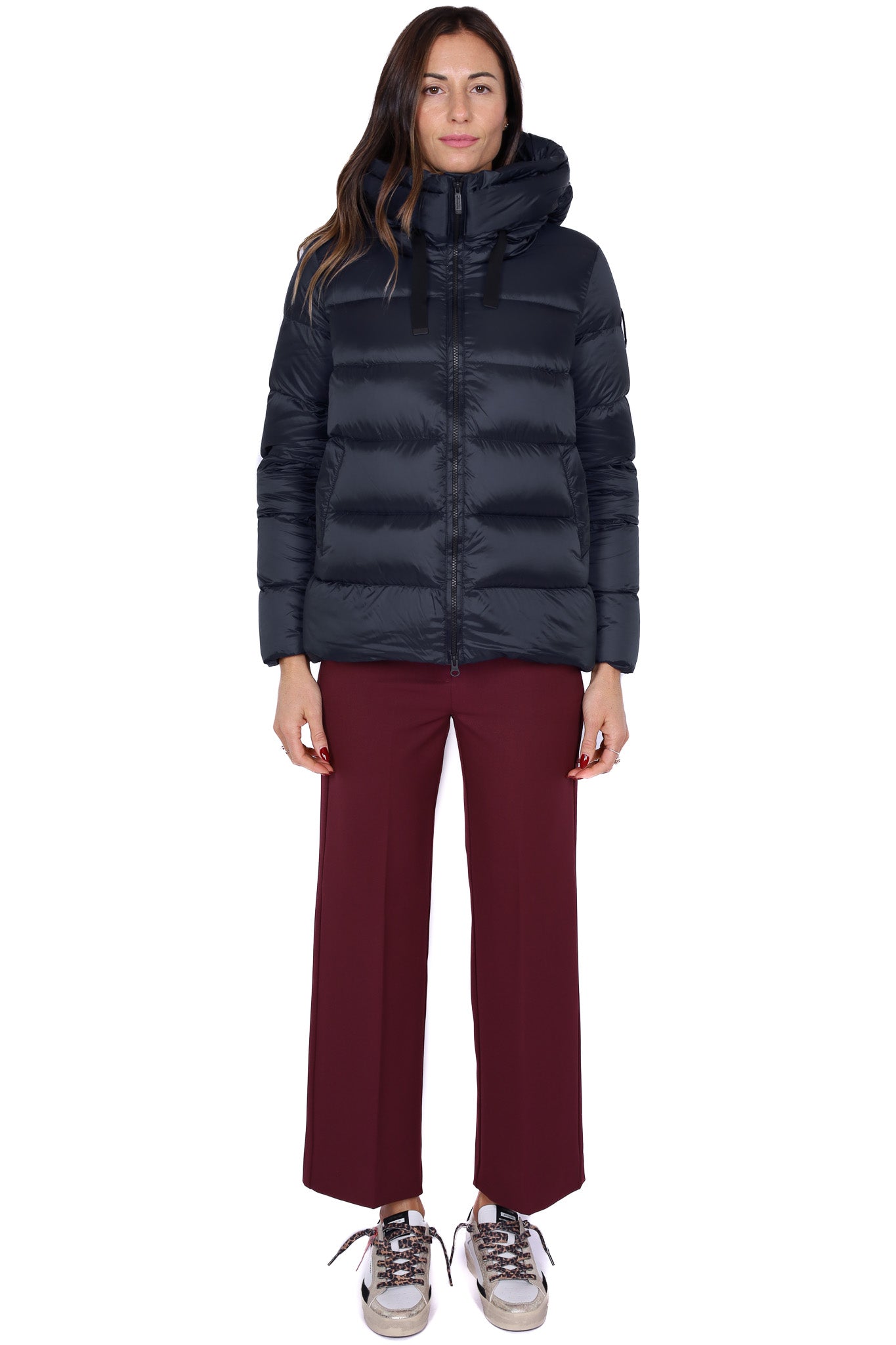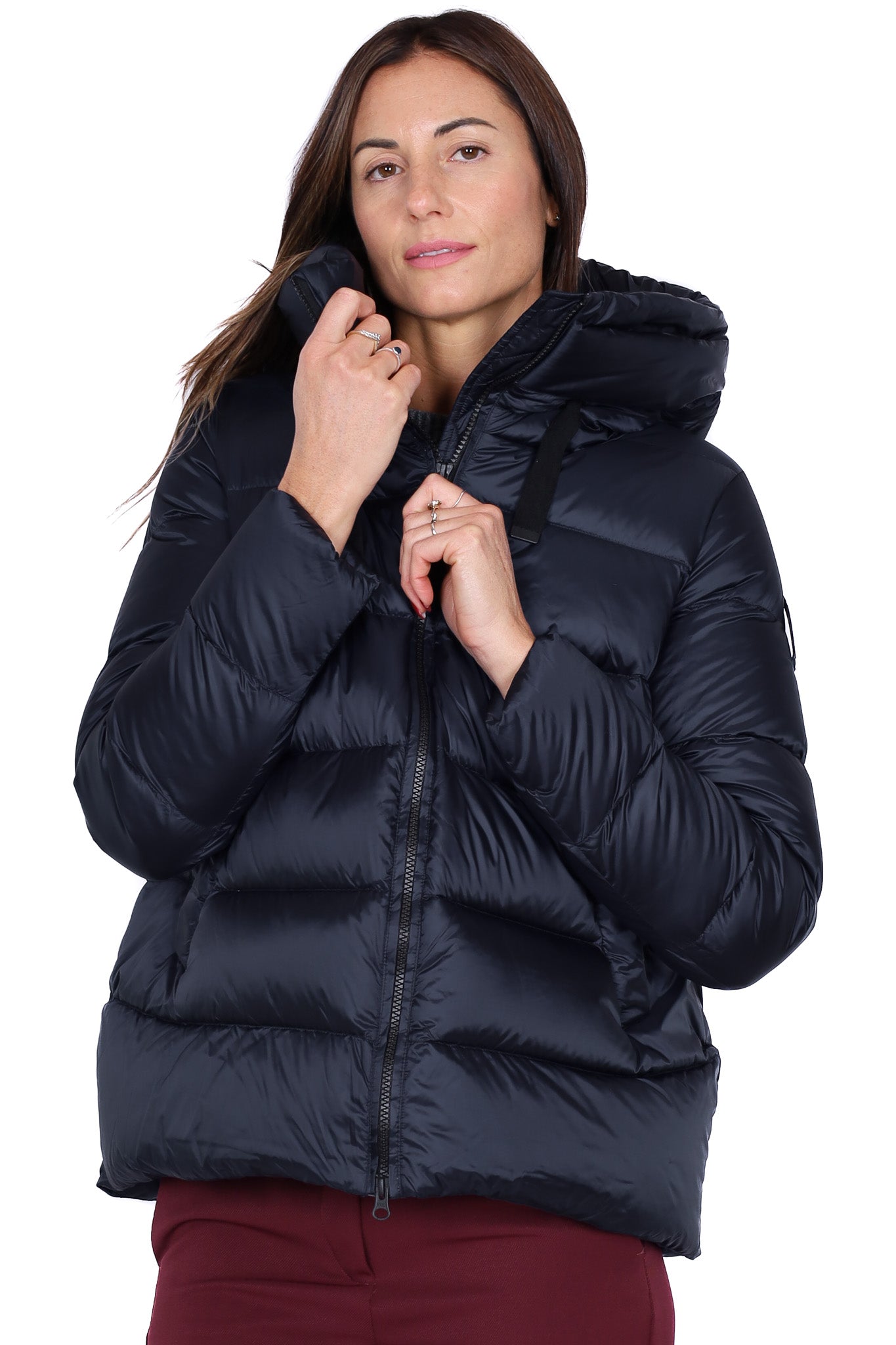 Piumino donna corto color blu scuro, imbottito e trapuntato a bande orizzontali, con cappuccio avvolgente regolabile tramite coulisse. Chiusura full zip doppio cursore, tasche laterali e linea leggermente svasata che valorizza il comfort senza rinunciare allo stile. Un modello ideale per la stagione fredda grazie a calore, leggerezza e grande versatilità.