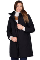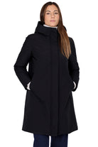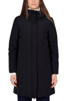 Parka da donna in tessuto tecnico nero, dal design essenziale con linea dritta e lunghezza al ginocchio, pensato per garantire protezione dal freddo e dalla pioggia mantenendo uno stile minimal e facile da abbinare. La chiusura frontale con zip nascosta e patta, il cappuccio fisso e le tasche laterali a filo assicurano praticità quotidiana senza appesantire la silhouette.