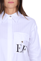 Camicia da donna in cotone bianco, silhouette oversize, impreziosita da maxi taschino con logo EF a contrasto sul petto. Colletto classico, polsini con bottone, abbottonatura nascosta e dettagli metallici dorati. Perfetta con jeans o pantaloni eleganti per un look sofisticato e contemporaneo. Composizione tessuto 100% cotone.
