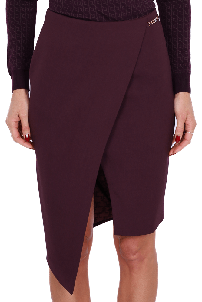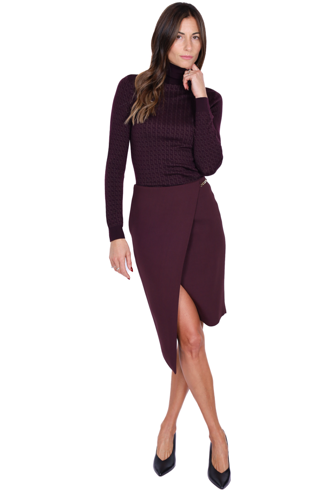 Gonna midi da donna in tessuto bordeaux, modello portafoglio con spacco anteriore asimmetrico e chiusura con elegante dettaglio oro sul fianco. Vestibilità aderente, vita alta e linea raffinata, ideale per look business chic o eventi serali eleganti. Composizione tessuto 60% Viscosa 40% Lana vergine