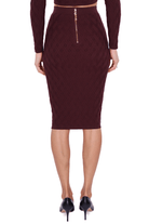 Gonna midi da donna in maglia bordeaux lavorata con motivo geometrico, silhouette aderente a tubino che valorizza le forme. Vita alta impreziosita da catena dorata frontale e zip posteriore logata, perfetta per look eleganti da ufficio o eventi serali. Composizione tessuto 50% Viscosa 28% Poliestere 22% Poliammide