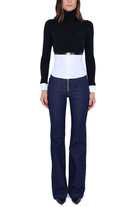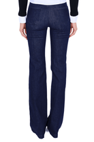 Jeans da donna in denim blu, vestibilità regular a gamba dritta con fondo a zampa, con dettaglio zip frontale oro e tasche applicate sul retro. Vita medio-alta, cuciture a contrasto e stile pulito, perfetto da abbinare sia a camicie che a maglie per look versatili e contemporanei. Composizione tessuto 79% Cotone 15% Lyocell 04% Elastomulieste 02% Elastane.
