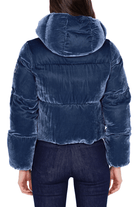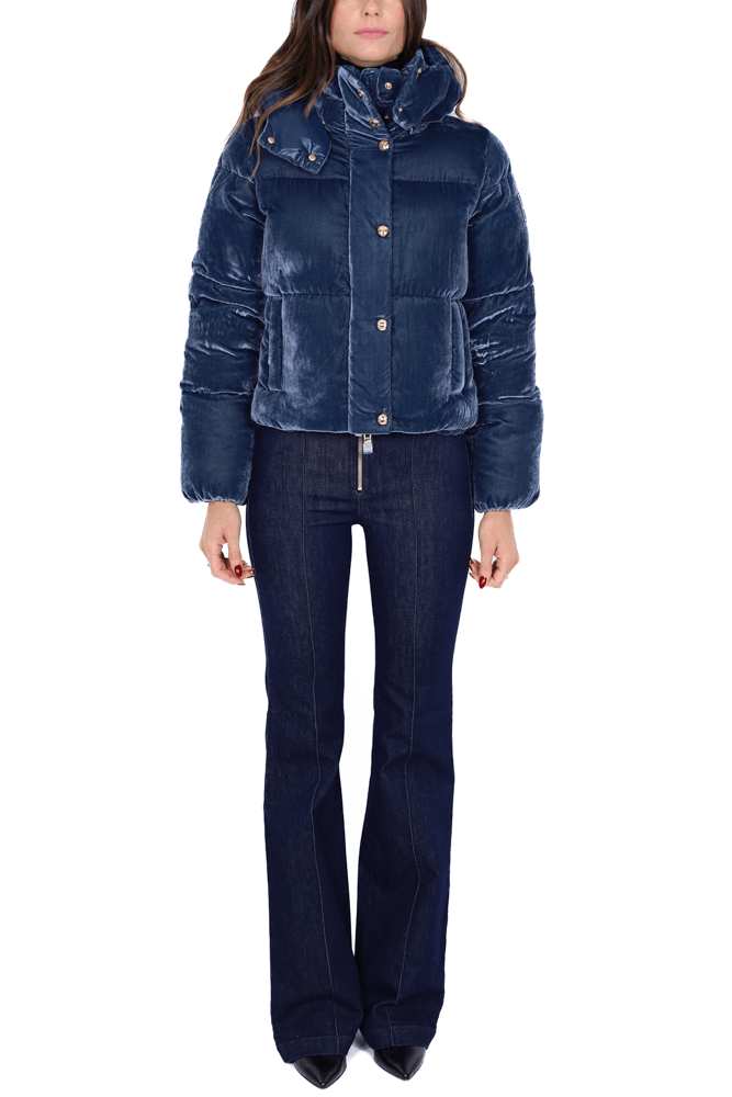 Piumino da donna realizzato in morbido velluto blu, design corto con cappuccio integrato e chiusura frontale con bottoni dorati a pressione. Imbottitura calda, linee leggermente oversize, tasche laterali e polsini elasticizzati per assicurare comfort e stile nelle giornate più fredde. Vestibilità regular. Composizione tessuto 75% Viscosa 25% Poliammide.