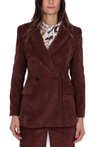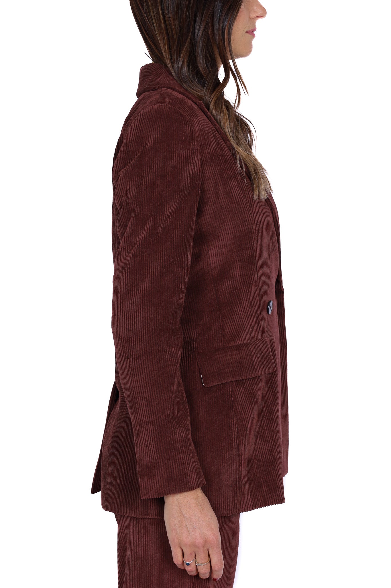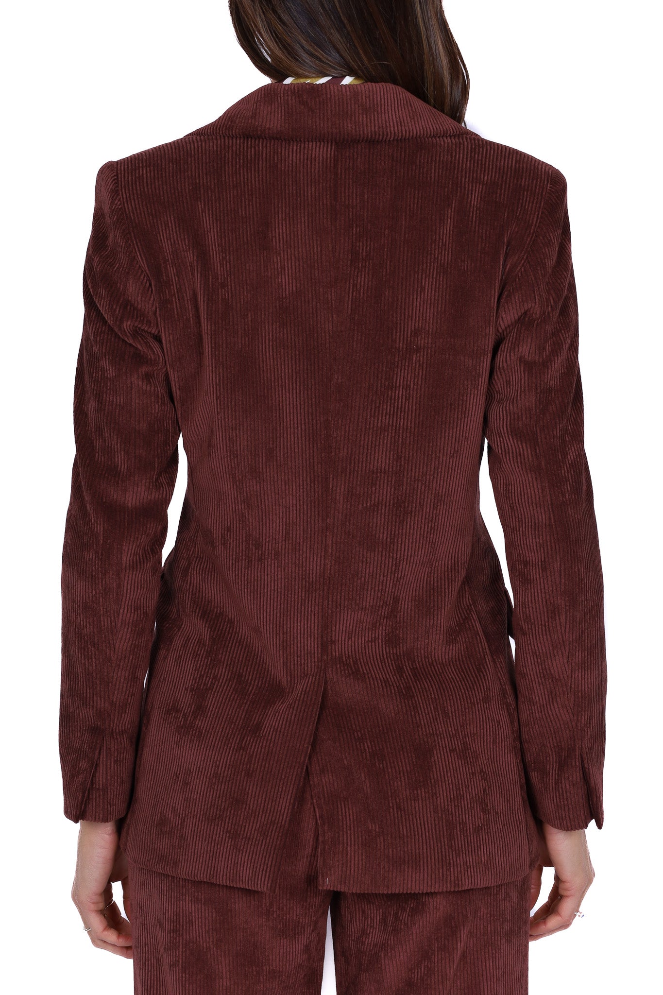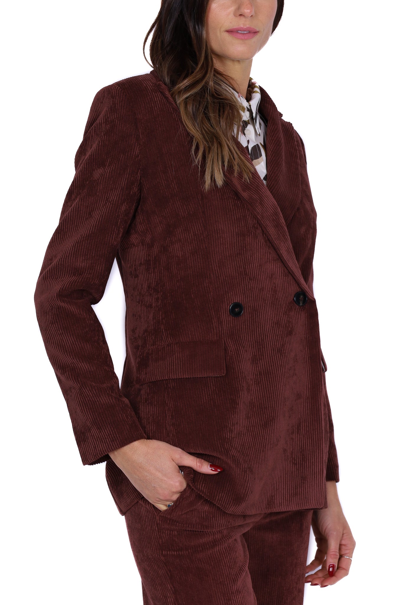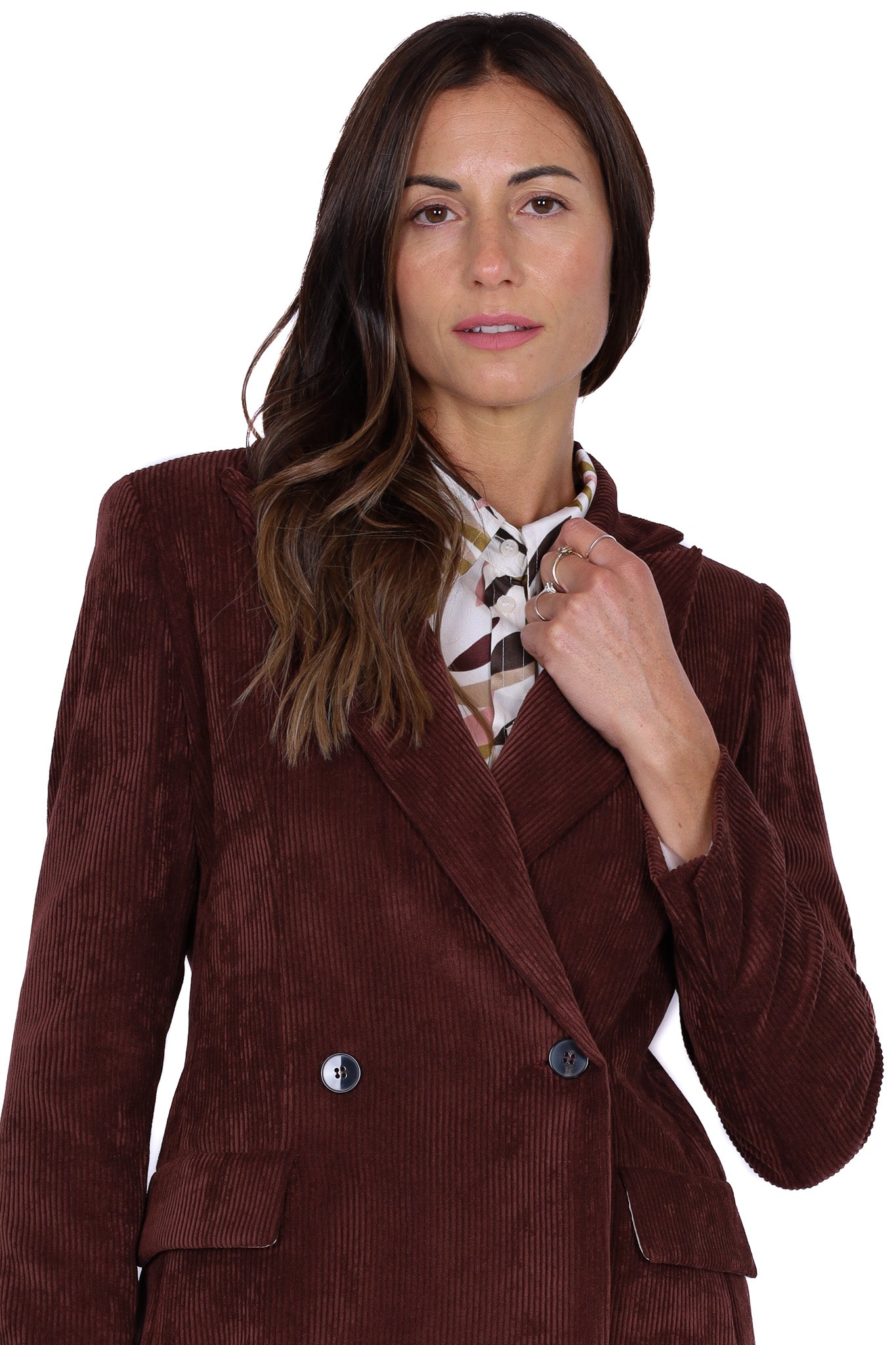 Giacca donna doppiopetto in velluto a coste color bordeaux, con rever classico, chiusura a due bottoni e tasche con pattina. La linea regolare e il tessuto a coste offrono comfort e stile rétro contemporaneo, ideale sia coordinata con il pantalone abbinato che con denim e gonne. Spacco centrale sul retro per maggiore vestibilità. Vestibilità regular.