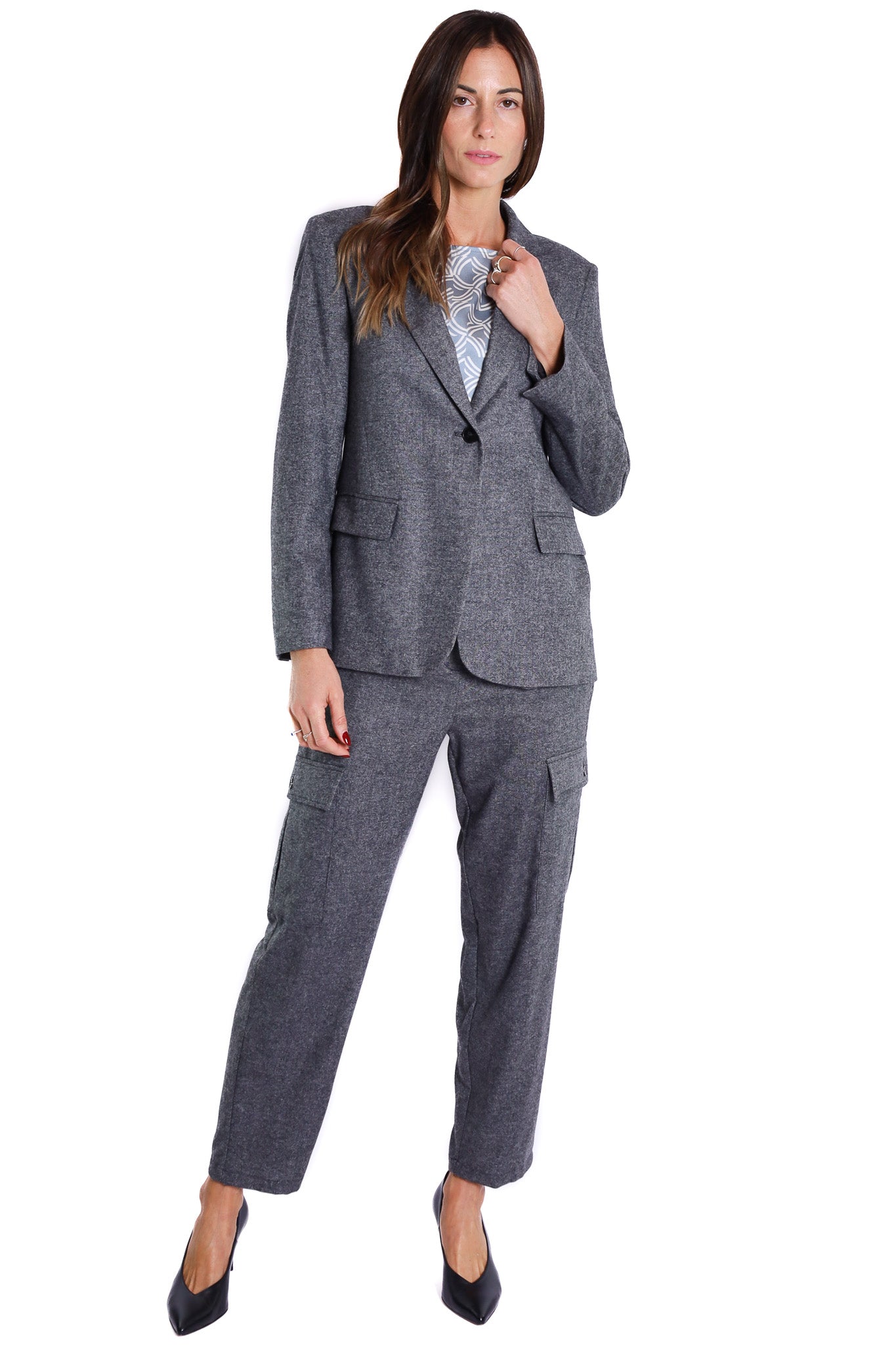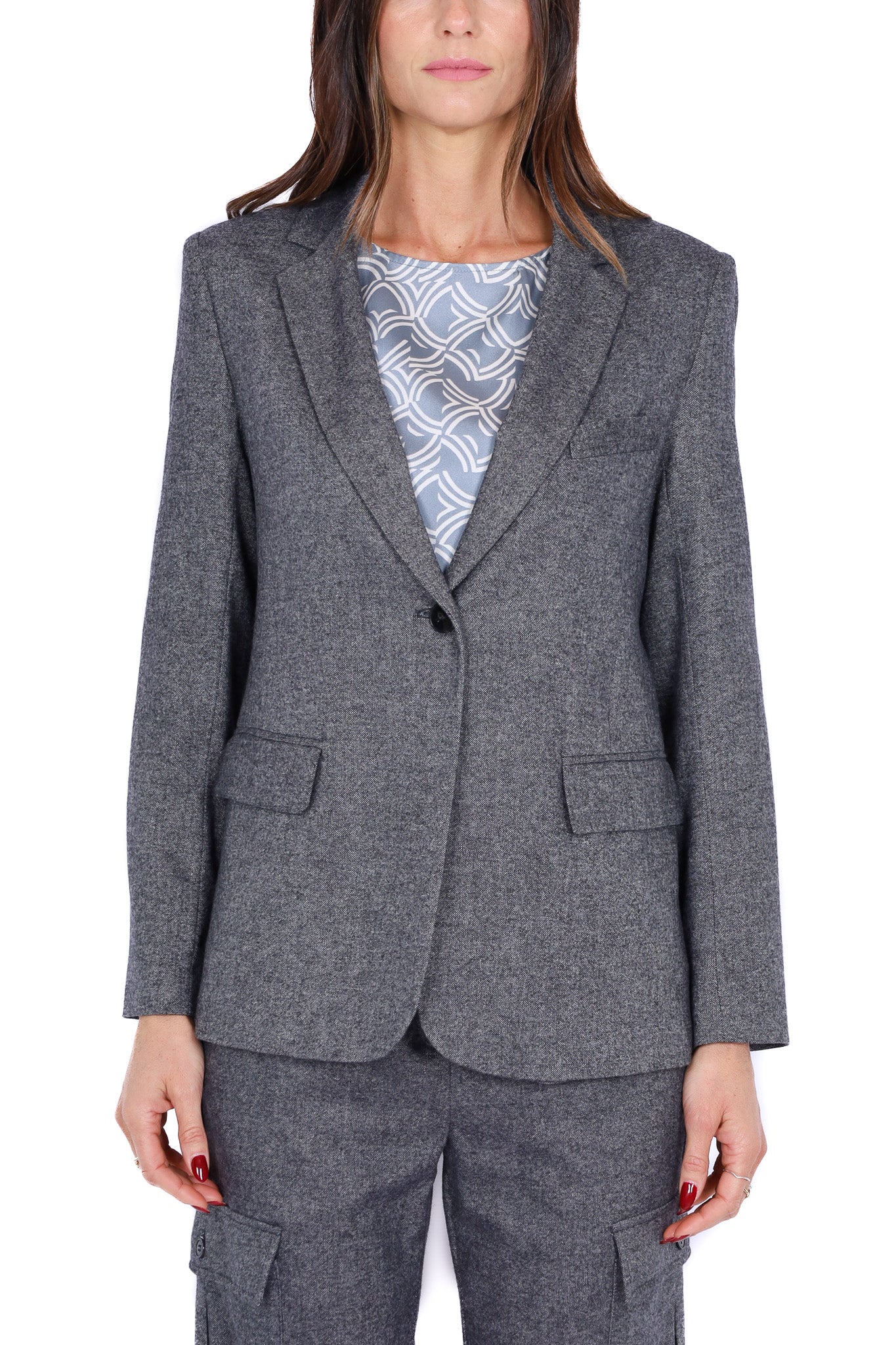 Giacca blazer da donna in tessuto misto lana grigia, dal taglio sartoriale e linea dritta. Monopetto con chiusura ad un bottone, rever classico e tasche con pattina. Ideale sia per look formali che per abbinamenti contemporanei con pantaloni cargo, perfetta come capospalla nei mesi più freddi per un'eleganza attuale e versatile. Vestibilità regolare.