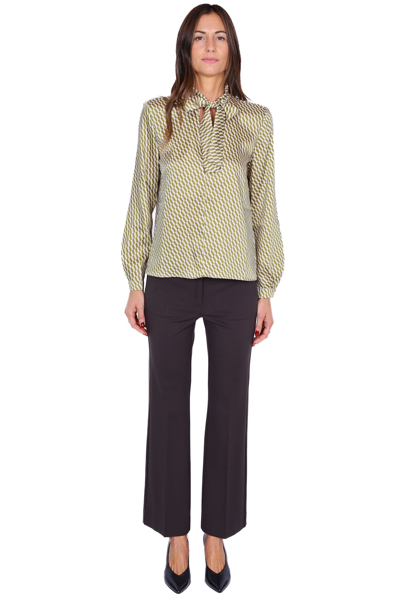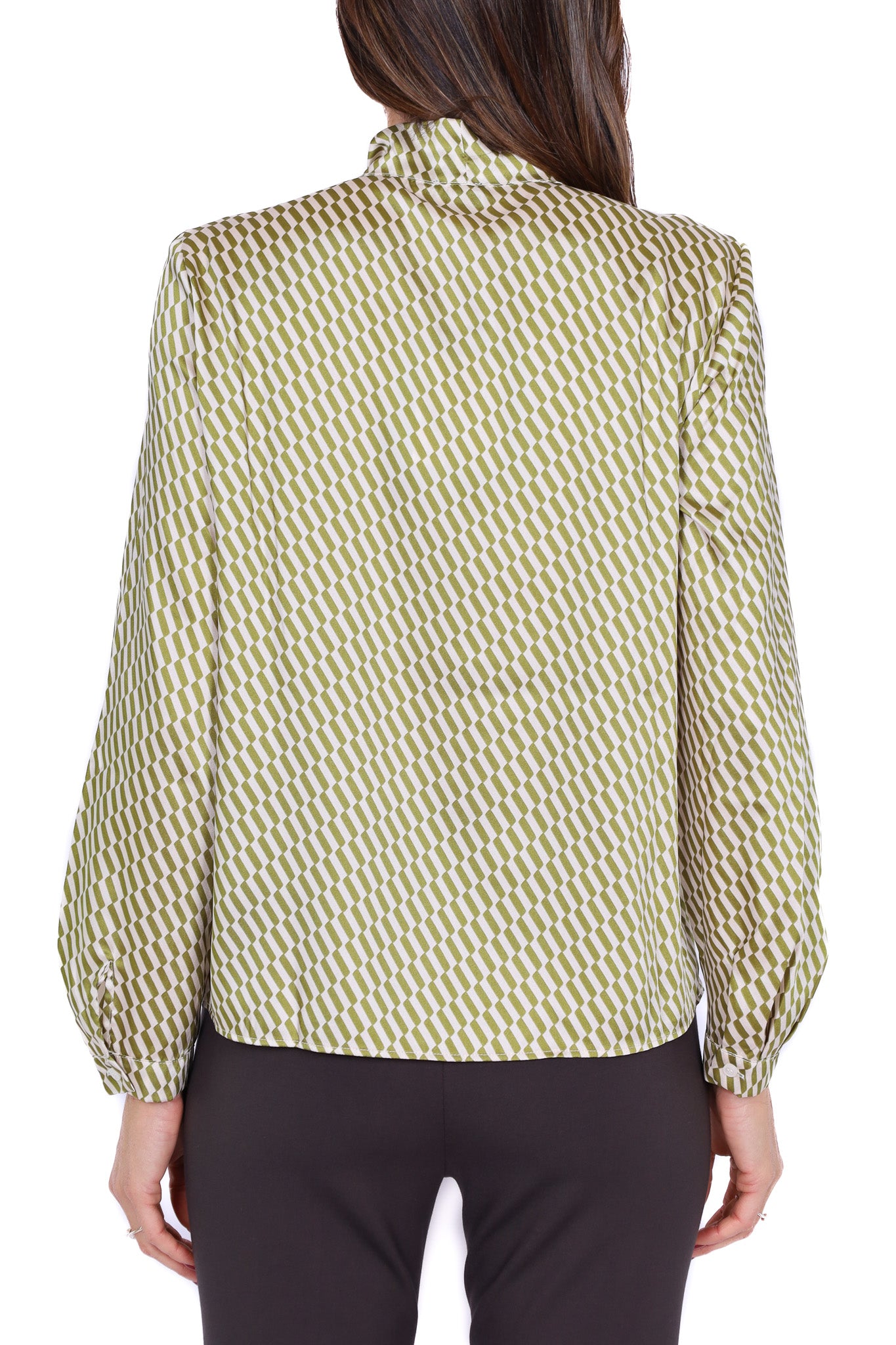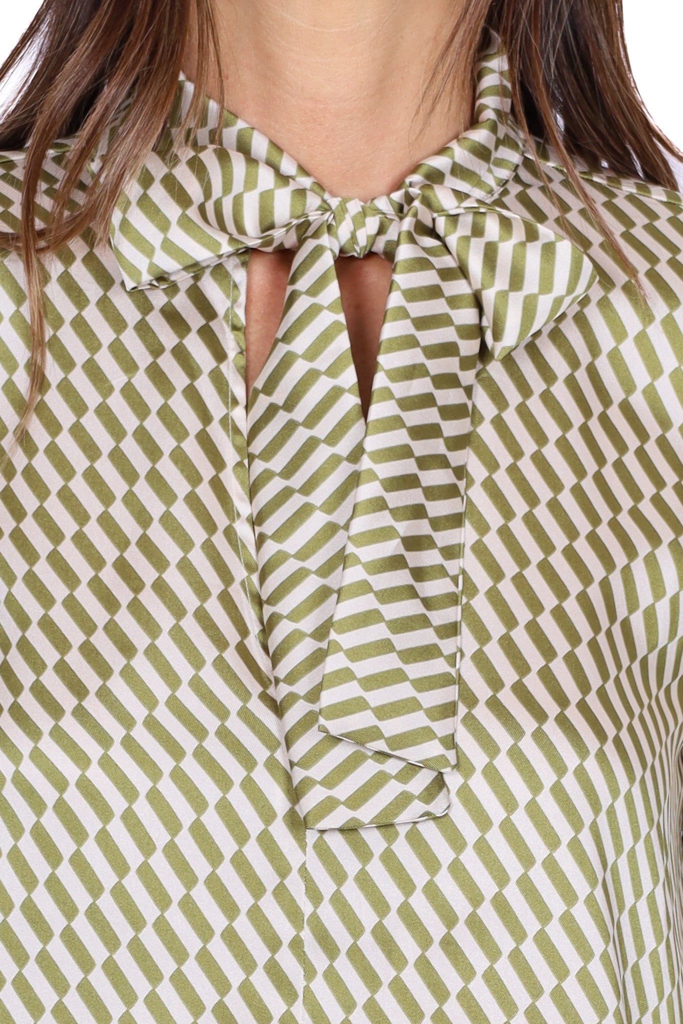 Blusa da donna in tessuto leggero, caratterizzata da una vivace fantasia geometrica nei toni del verde e del bianco. Il modello presenta una vestibilità fluida, maniche lunghe con polsino e dettaglio annodato al collo che aggiunge un tocco elegante e femminile al capo. Versatile e raffinata, ideale da abbinare sia a pantaloni che a gonne per look da ufficio o tempo libero.