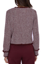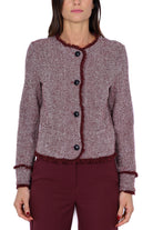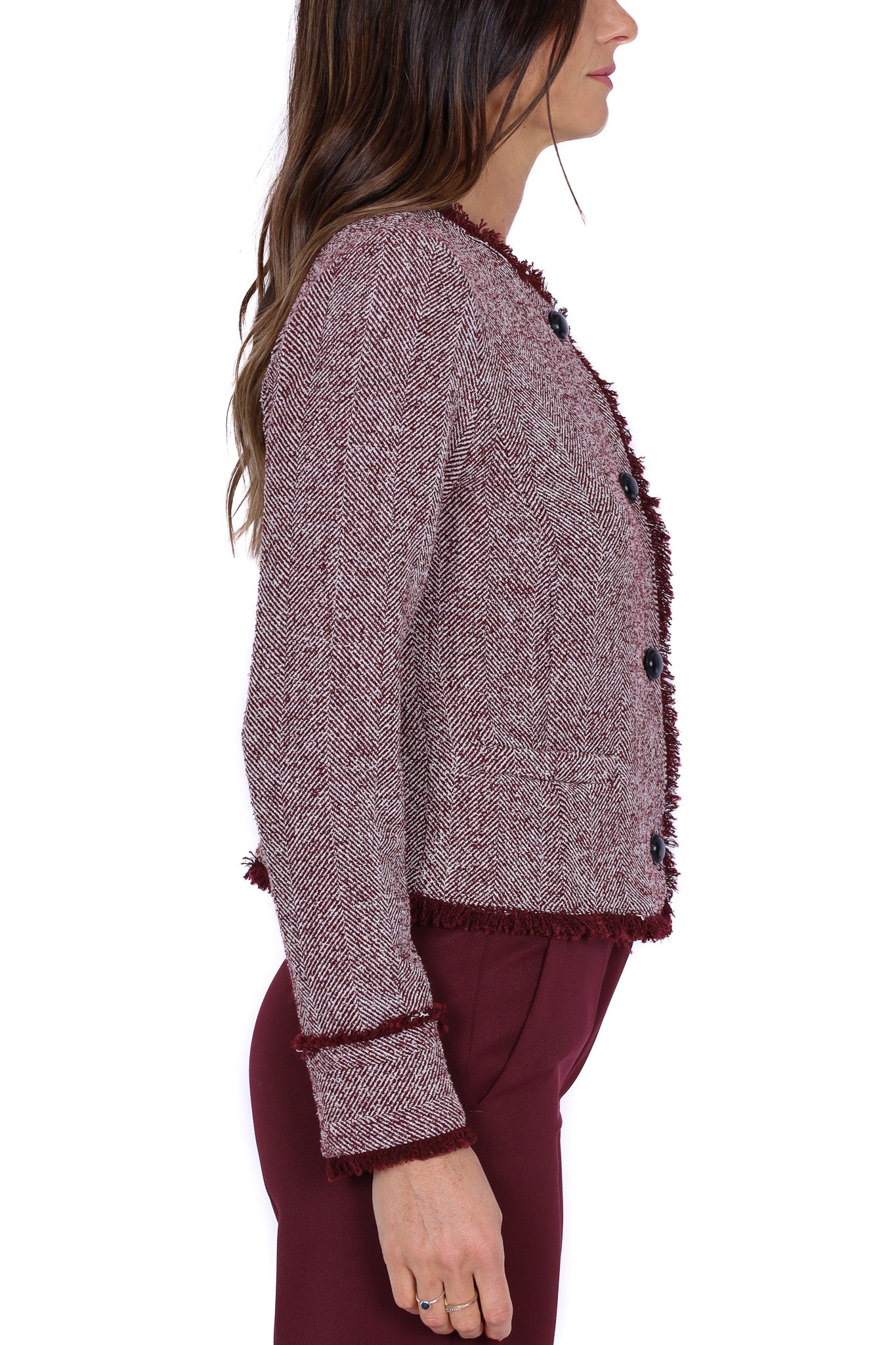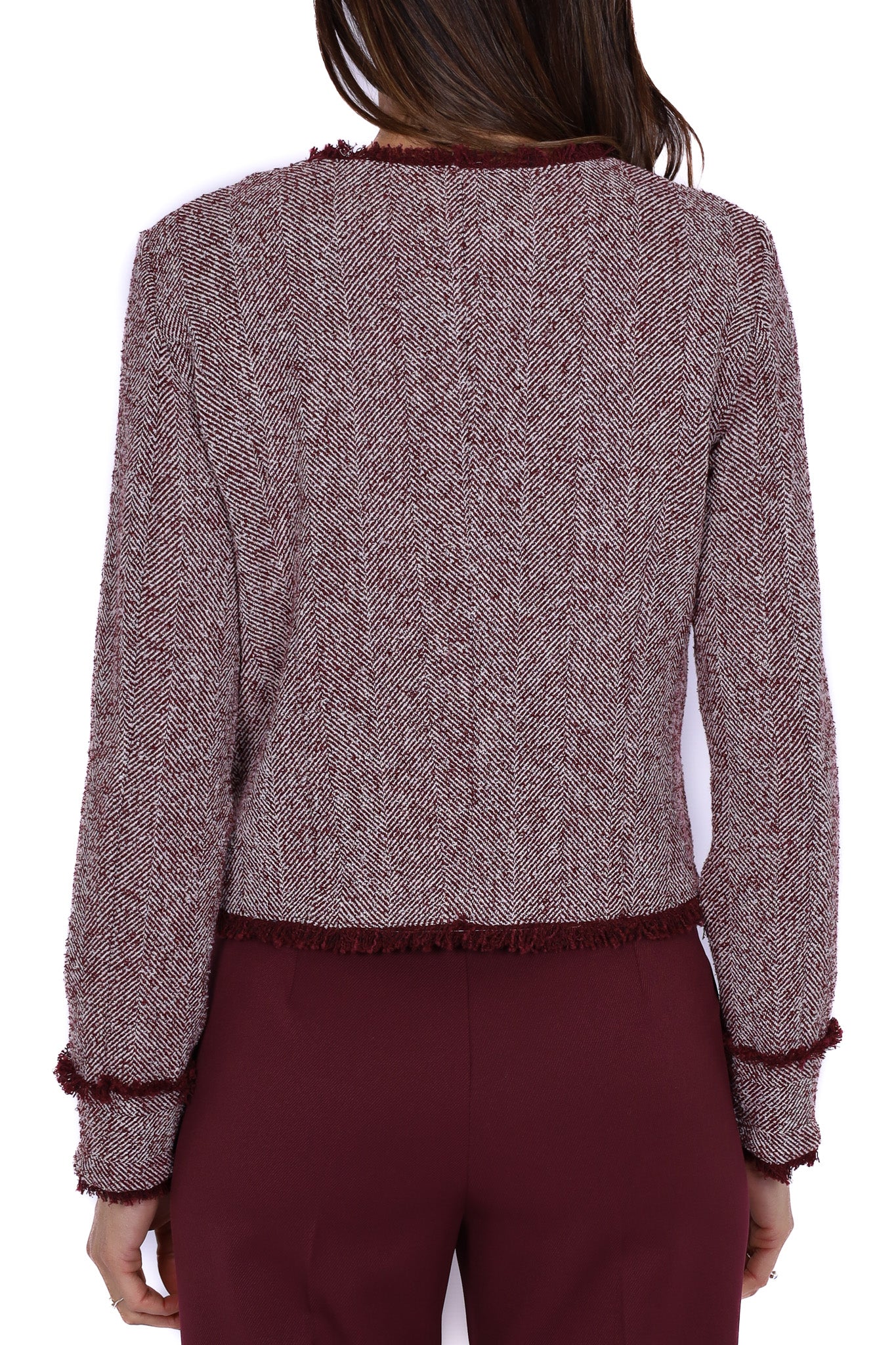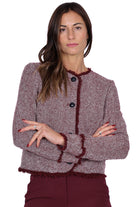 Giacca donna corta dalla lavorazione tweed nei toni del bordeaux, con bottoni a contrasto frontali e profili rifiniti da micro frange ton sur ton. Linea dritta, girocollo e dettaglio frangiato anche sui polsi e sul fondo. Perfetta per completare look eleganti e raffinati o dare un tocco chic a outfit casual.