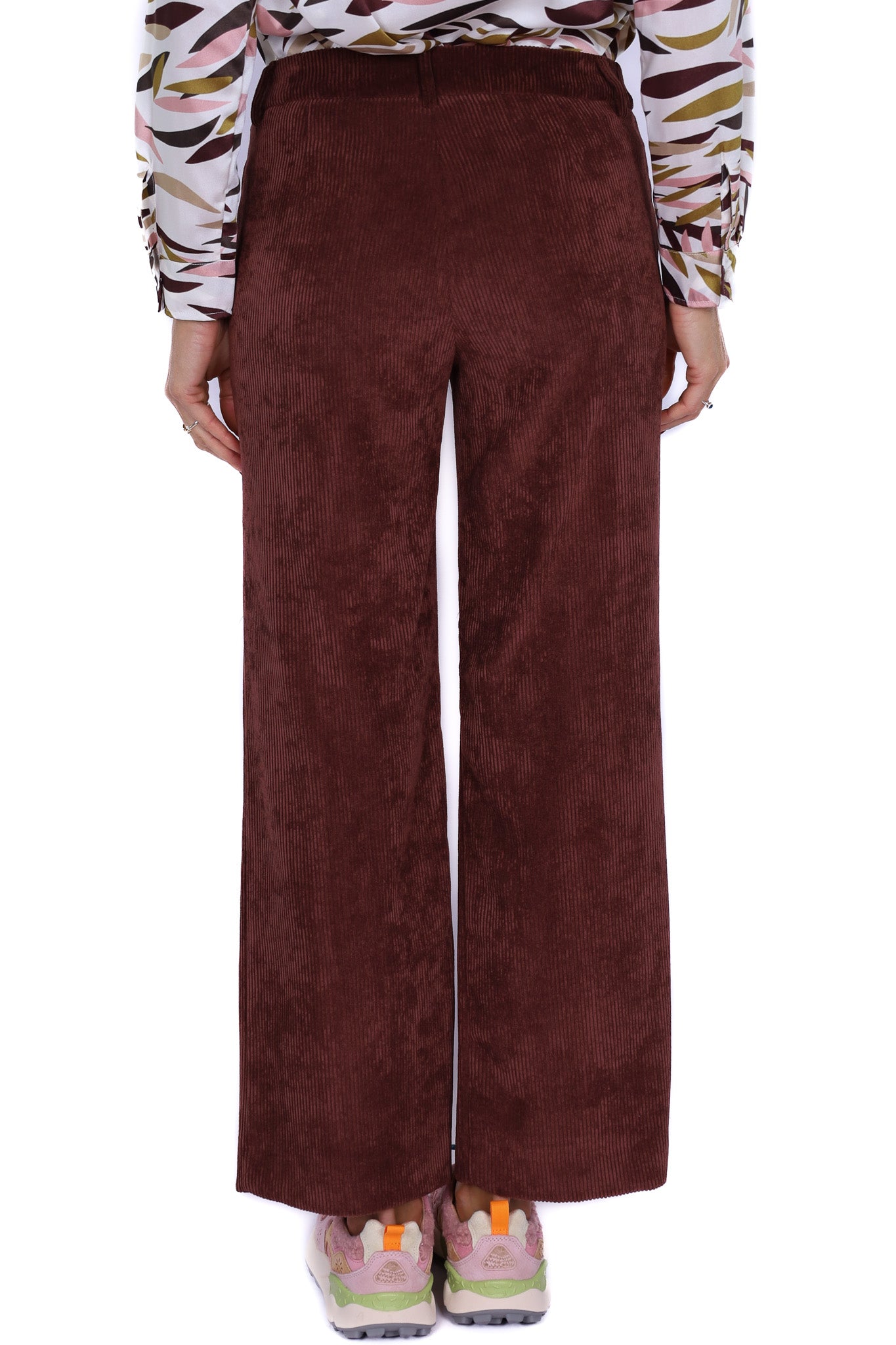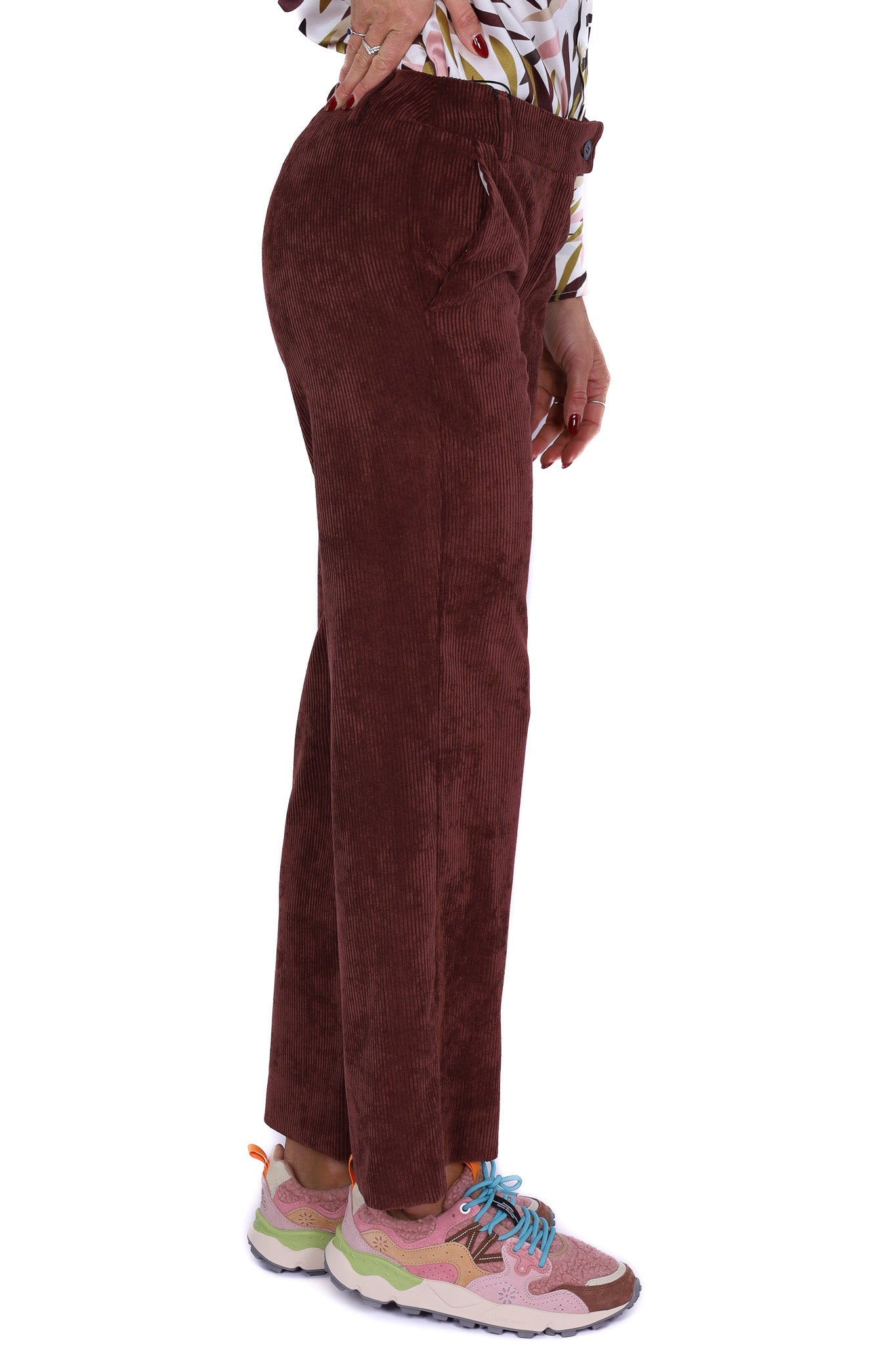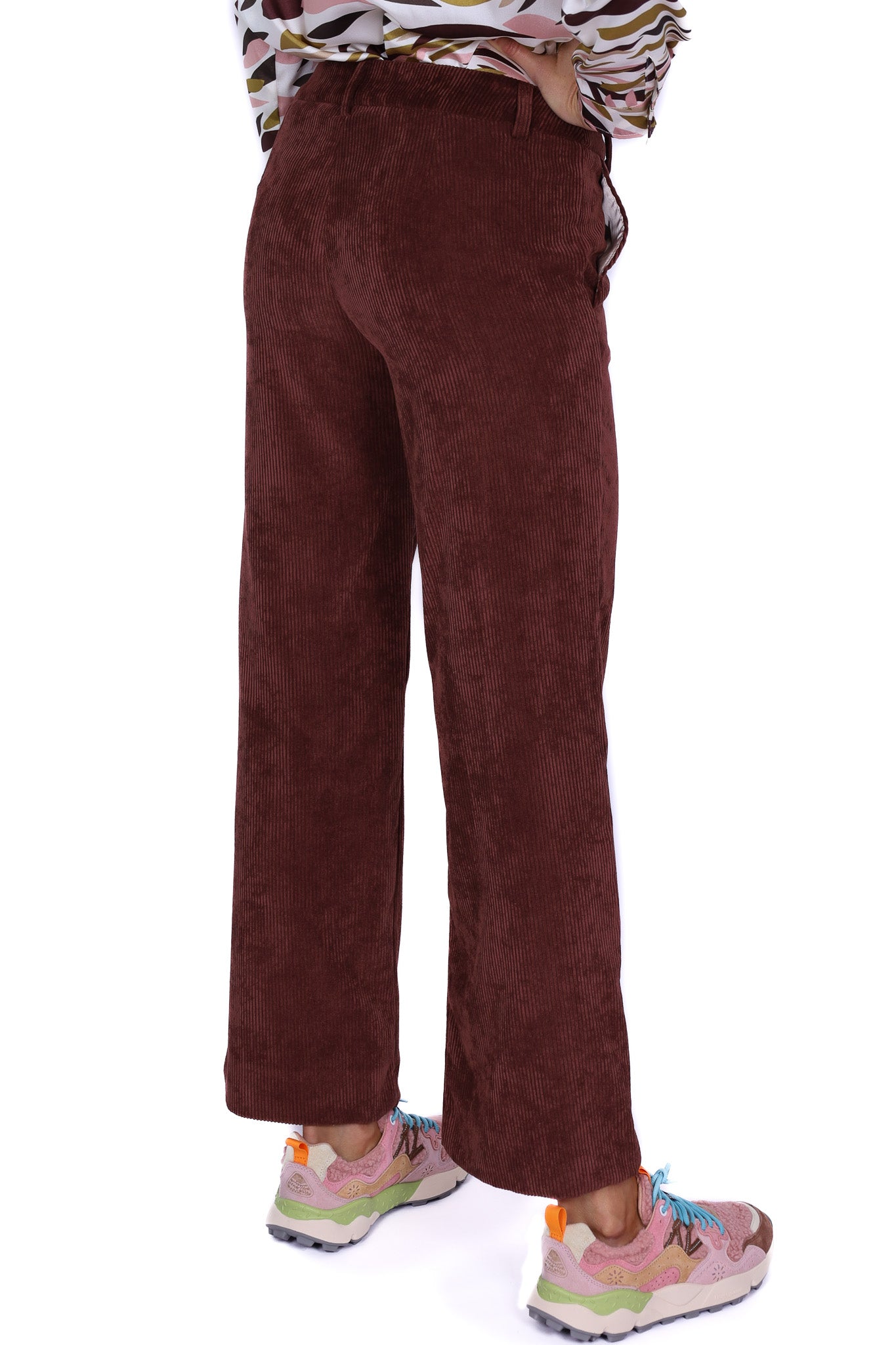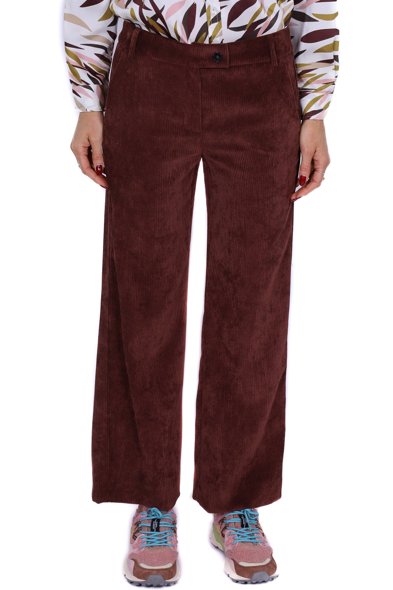 Pantaloni donna a palazzo in velluto a coste color bordeaux. Modello a vita regolare con linea ampia e gamba dritta, chiusura frontale con bottone e zip, passanti in vita e tasche laterali inserite. Il tessuto a coste regala texture e comfort, perfetto per look casual o elegant-cool.