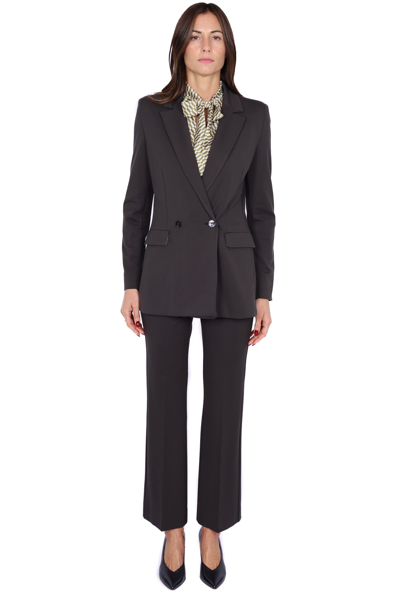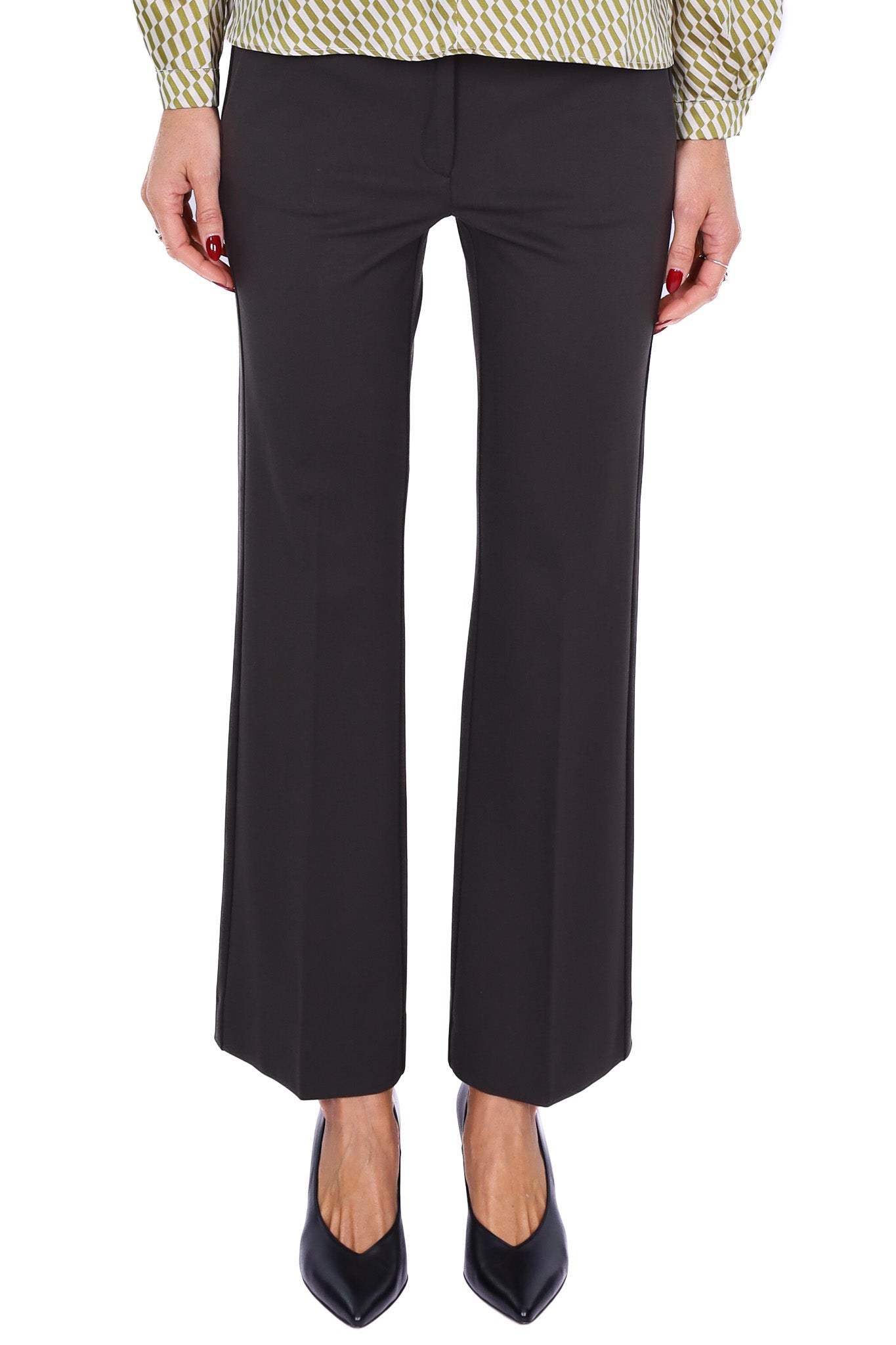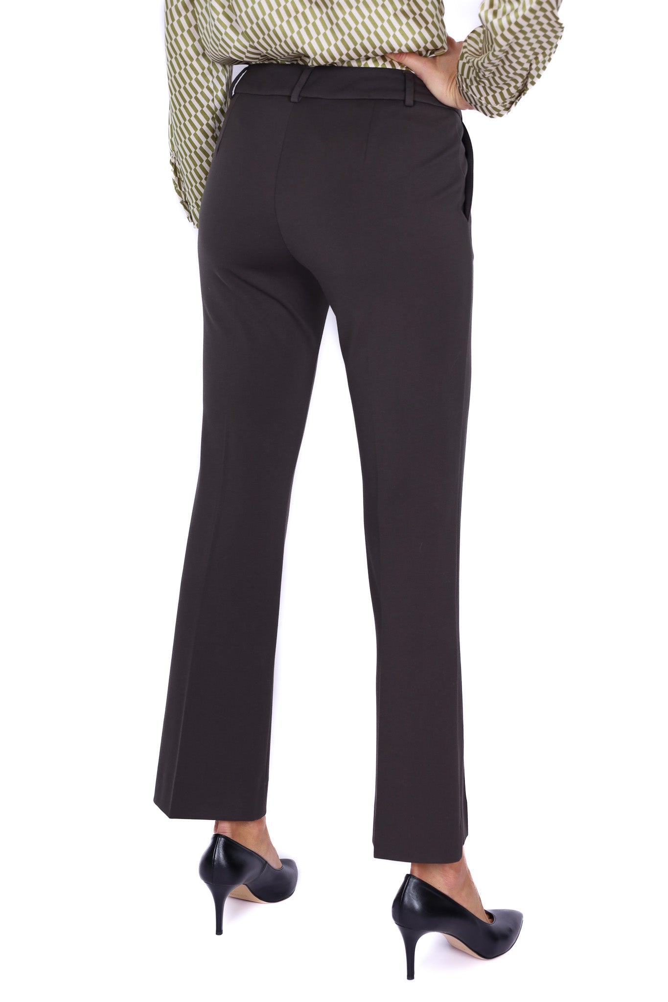 Pantalone da donna in tessuto marrone scuro/nero, taglio dritto a sigaretta, con passanti in vita per cintura. Vestibilità asciutta, chiusura nascosta e tasche laterali. Un capo essenziale dal design minimal e versatile, perfetto sia abbinato al blazer coordinato per un completo elegante, sia con bluse colorate per look più casual e contemporanei.