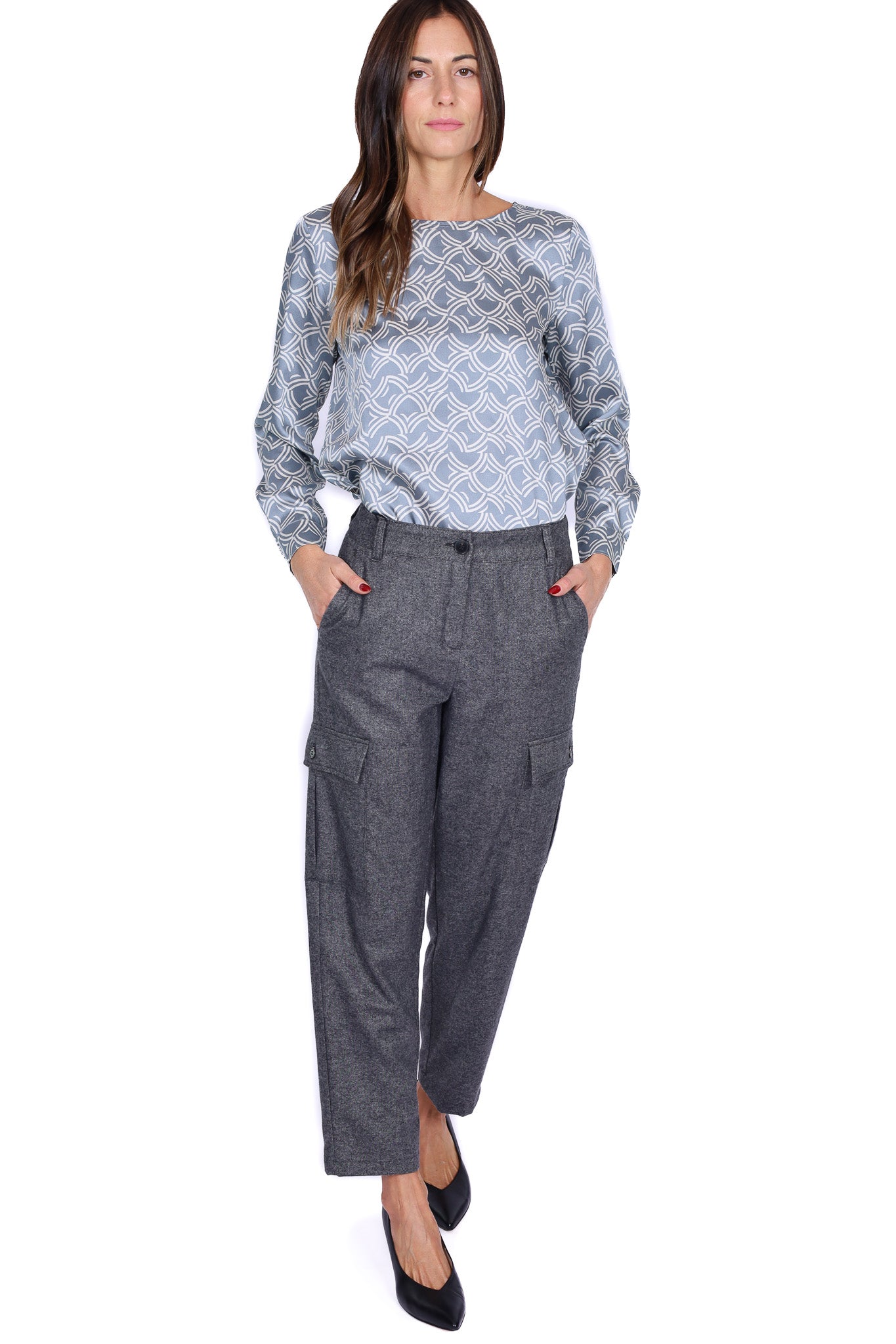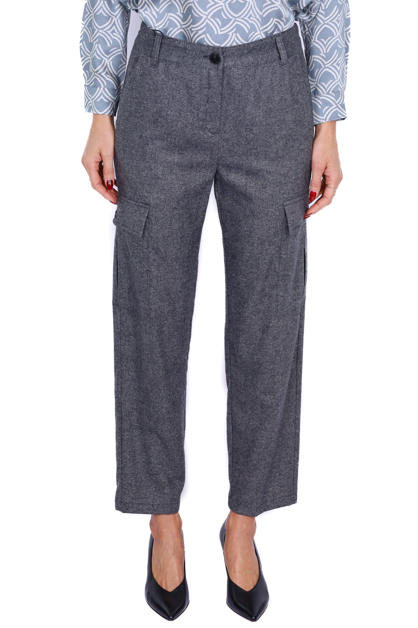 Pantaloni da donna modello cargo, realizzati in morbido tessuto misto lana color grigio medio. Linea dritta, vita regolare con passanti per cintura, chiusura frontale con bottone e zip. Presentano tasche laterali applicate con pattina e fondo leggermente stretto, ideali per uno stile casual e contemporaneo. Perfetti sia con sneakers che con décolleté per un look day-to-night. Vestibilità regolare.