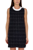 Abito donna smanicato corto in tweed nero a fantasia check, con scollo tondo e profilo a coste bianche a contrasto. Chiusura con bottoncini decorativi sulla spalla, linea dritta e vestibilità regular, pensato per essere abbinato come coordinato alla giacca in tweed o indossato da solo per un look sofisticato e attuale.