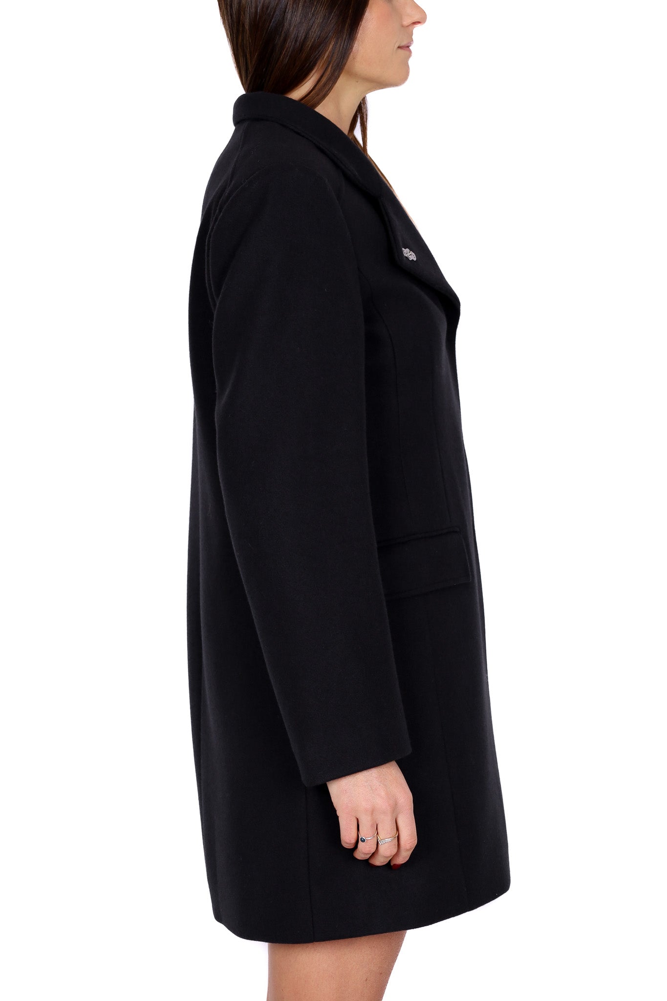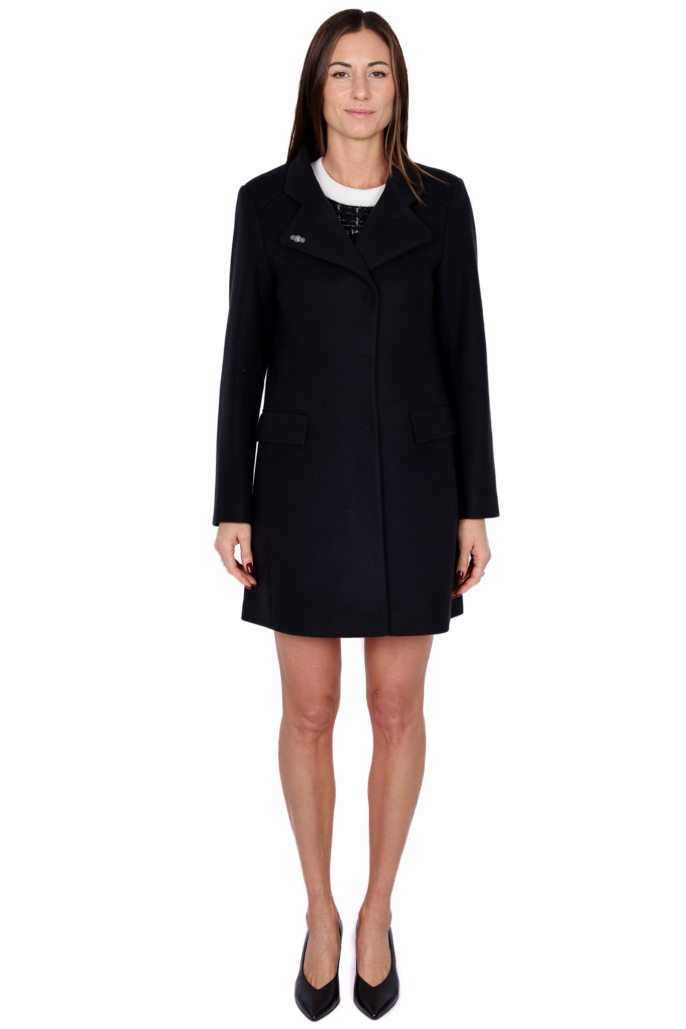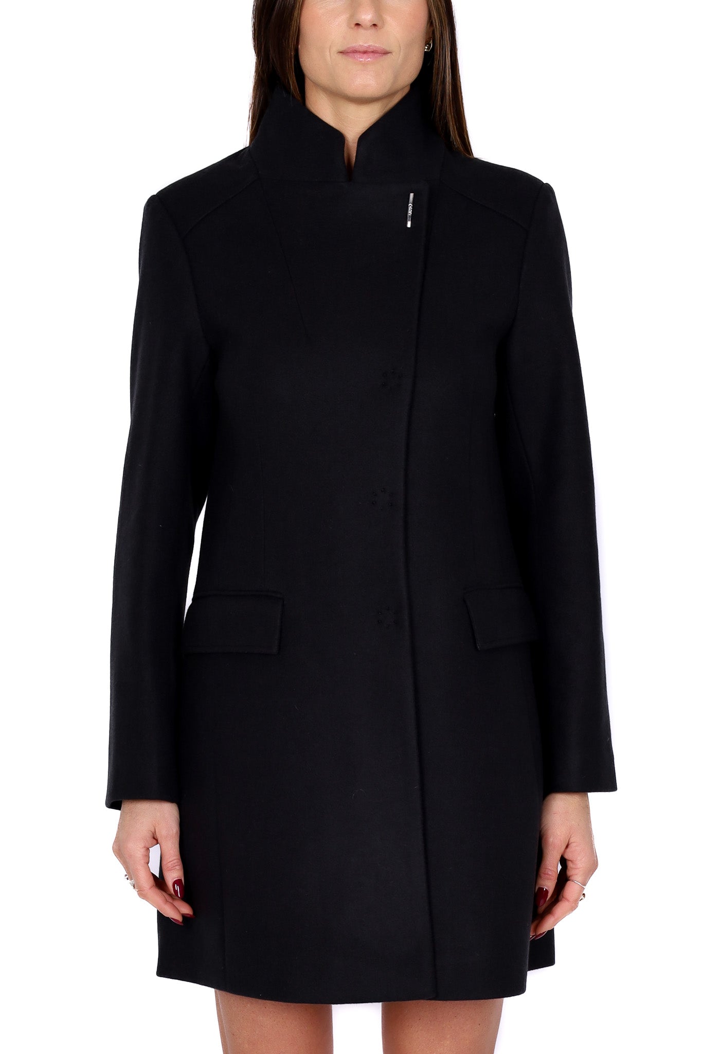 Cappotto donna corto in tessuto di lana nero con silhouette pulita e moderna. Chiusura nascosta monopetto, collo alto strutturato per una linea elegante e professionale, tasche con pattina e taglio dritto. Perfetto per l’inverno in città e ideale sia su outfit formali che casual chic.