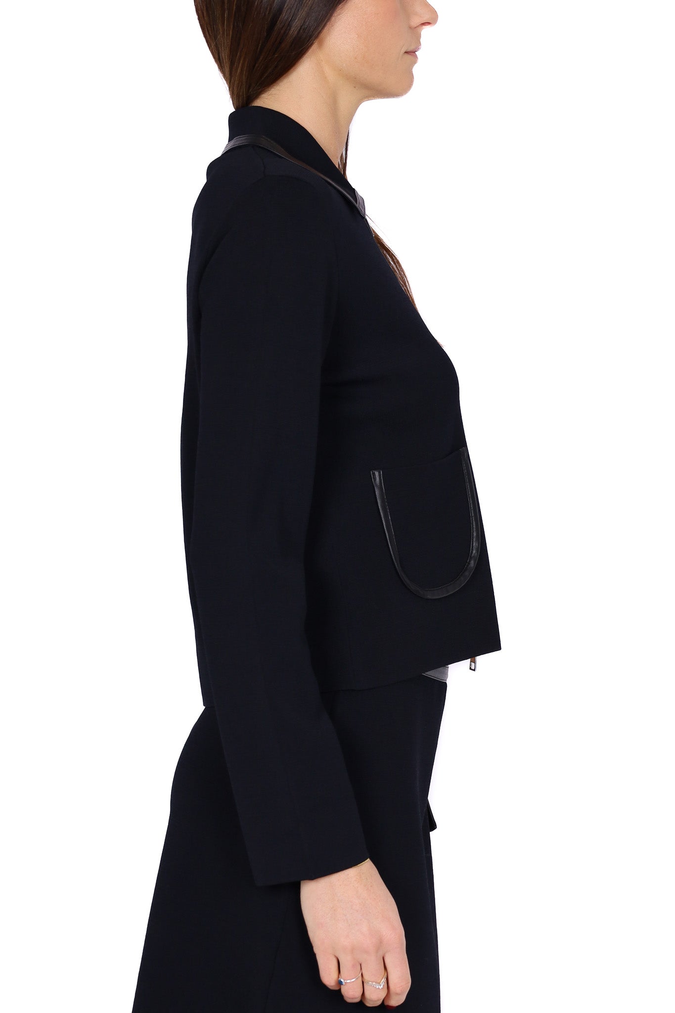 Giacca nera corta in maglia stretch, arricchita da zip centrale e profili in ecopelle che rifiniscono il colletto e le tasche applicate sul davanti. Il design minimale dialoga con materiali moderni, donando al capo uno stile raffinato, essenziale ma con carattere, perfetto sia sopra la gonna coordinata sia per look urban chic da città.
