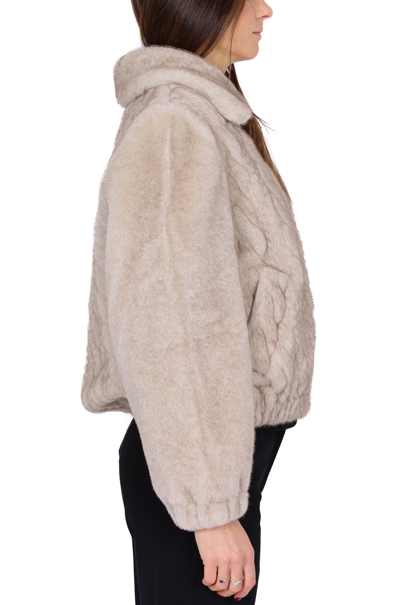 Giacca donna corta effetto pelliccia in caldo tessuto beige, caratterizzata dal design con lavorazione a trecce, zip centrale a tutta lunghezza e colletto ampio stile camicia. L'orlo e i polsini sono elasticizzati per una vestibilità comoda e moderna. Ideale per look casual raffinati o per aggiungere un tocco glamour agli outfit quotidiani, garantisce calore e stile senza l’utilizzo di vera pelliccia.