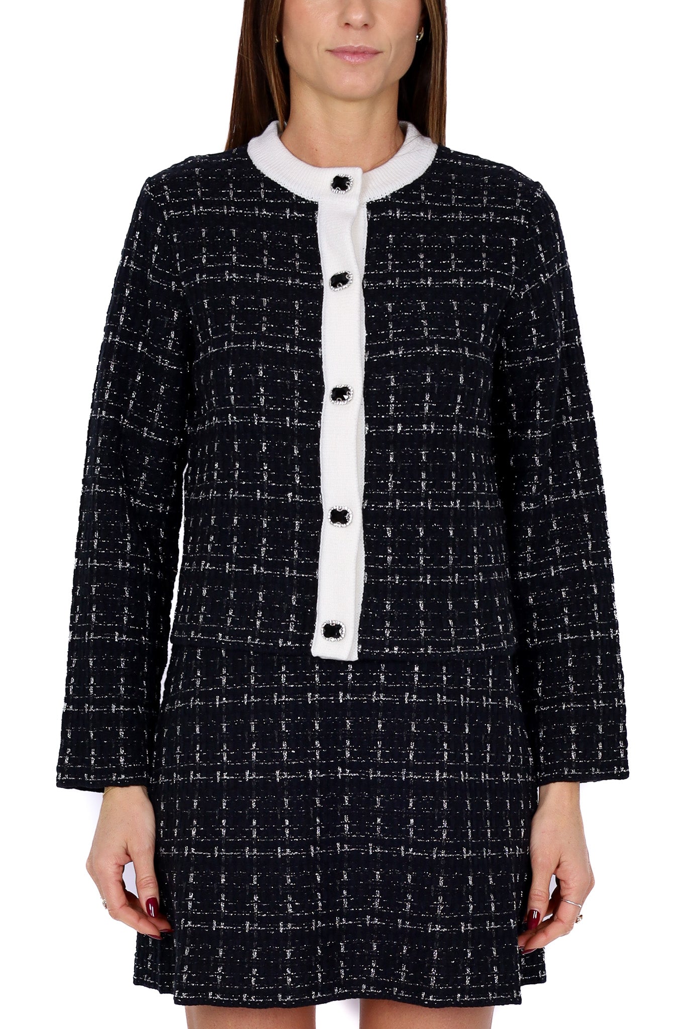 Giacca donna corta in tweed nero a fantasia check con profili bianchi a contrasto su scollo e abbottonatura. Chiusura frontale con bottoni gioiello, manica lunga e linea leggermente boxy. Un modello elegante e senza tempo, perfetto per creare tailleur femminili oppure per completare look casual chic con un tocco sofisticato.