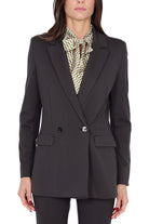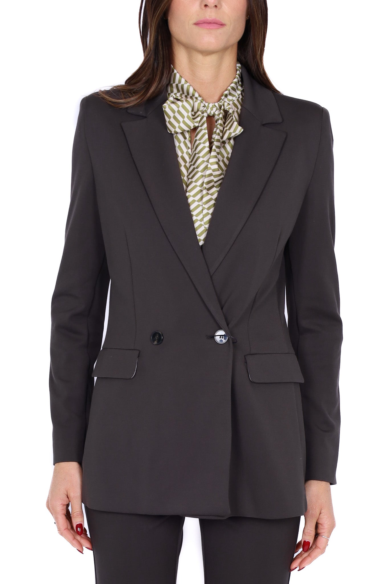 Blazer da donna in tessuto marrone scuro/nero, monopetto, dal taglio dritto e strutturato per una vestibilità regular: elegante e versatile. Colletto a rever classico, chiusura con due bottoni, tasche con pattina e maniche lunghe. Un capo passepartout da indossare sia in abbinamento a pantaloni coordinati che per sdrammatizzare look più casual.
